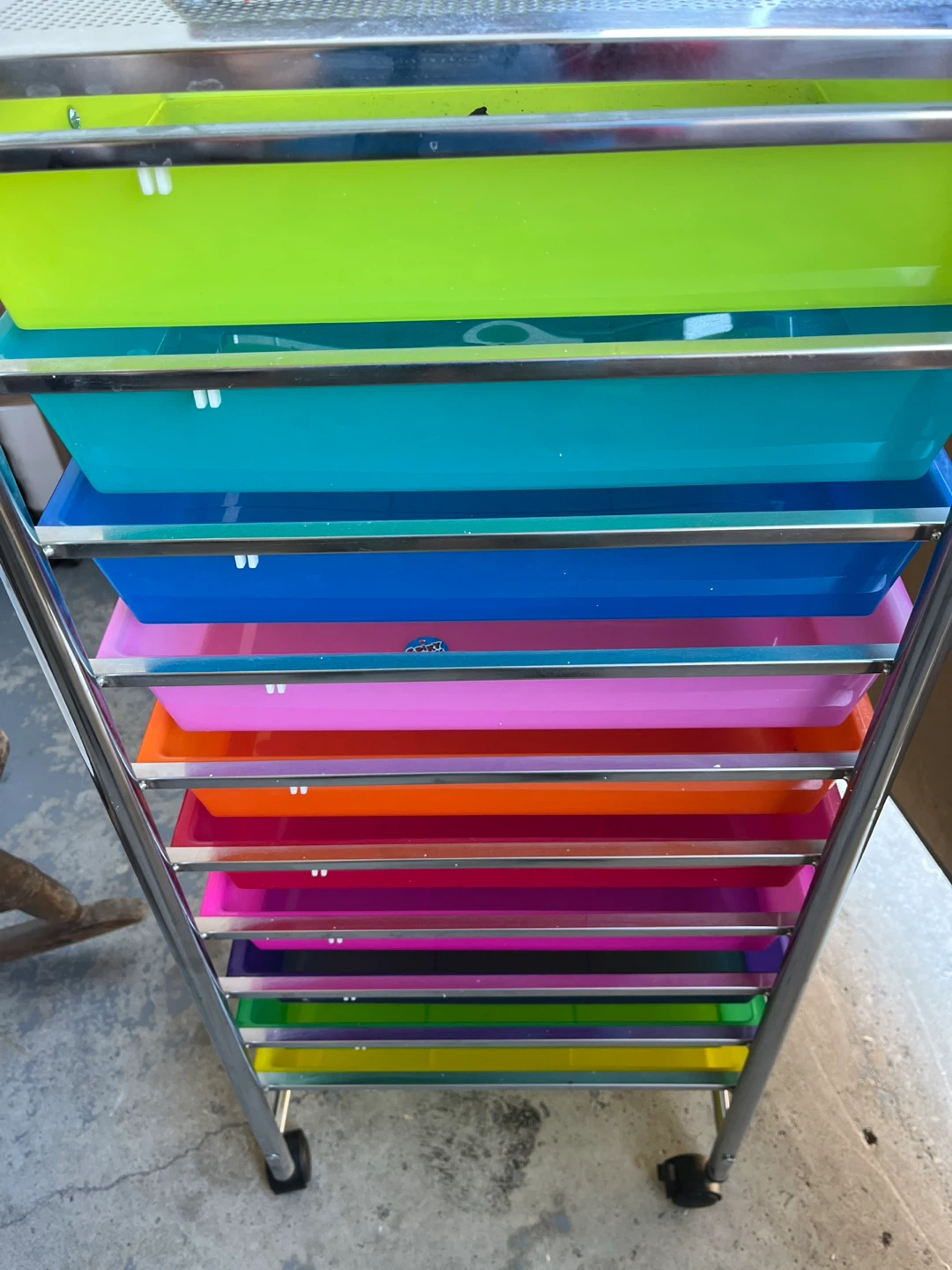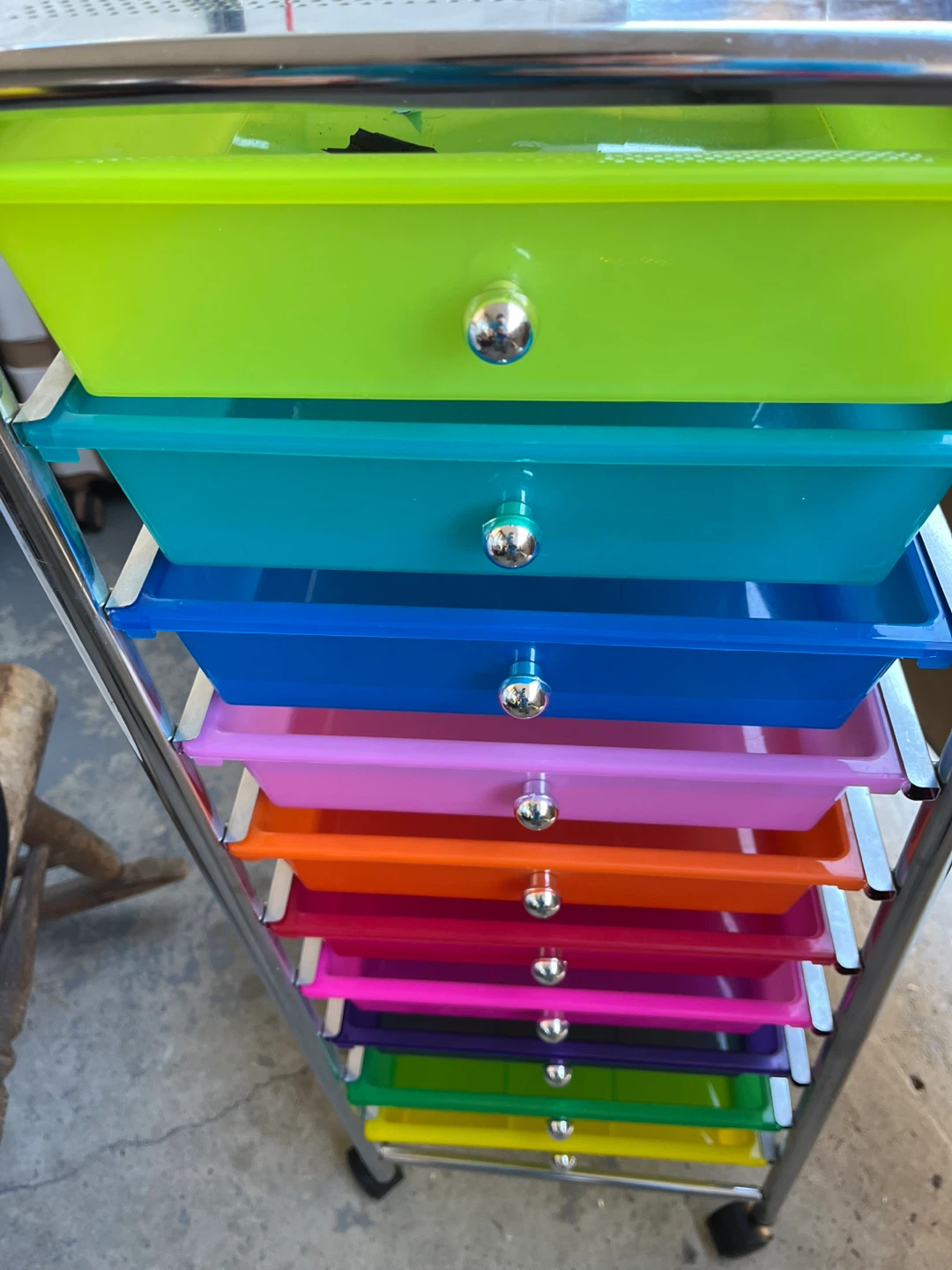 Here's a fun and functional rolling cart! It features 10 colourful drawers in a rainbow of shades. Perfect for organizing your art supplies, office essentials, or anything else you need to keep tidy. It's in great shape and ready to roll into your home!