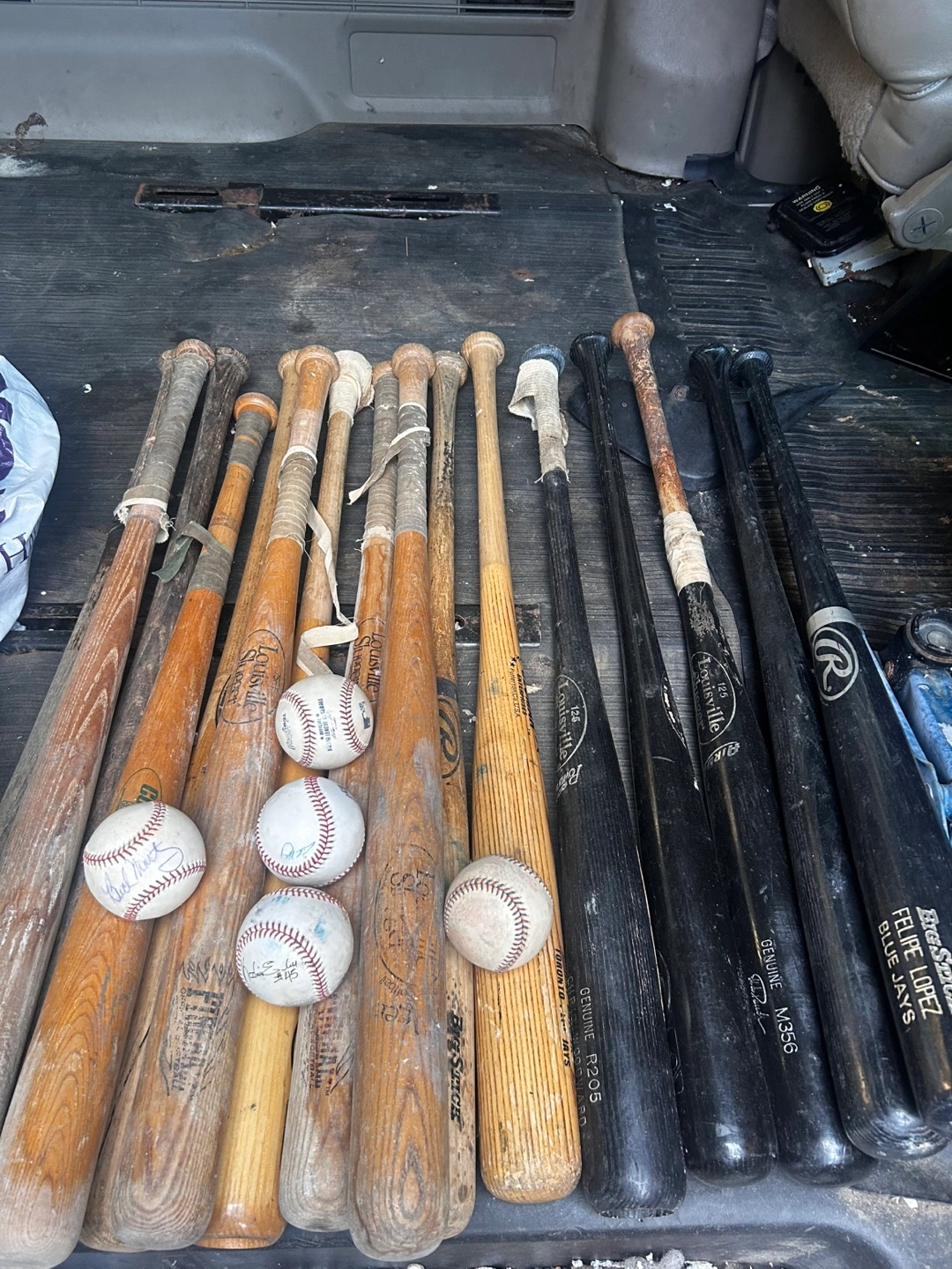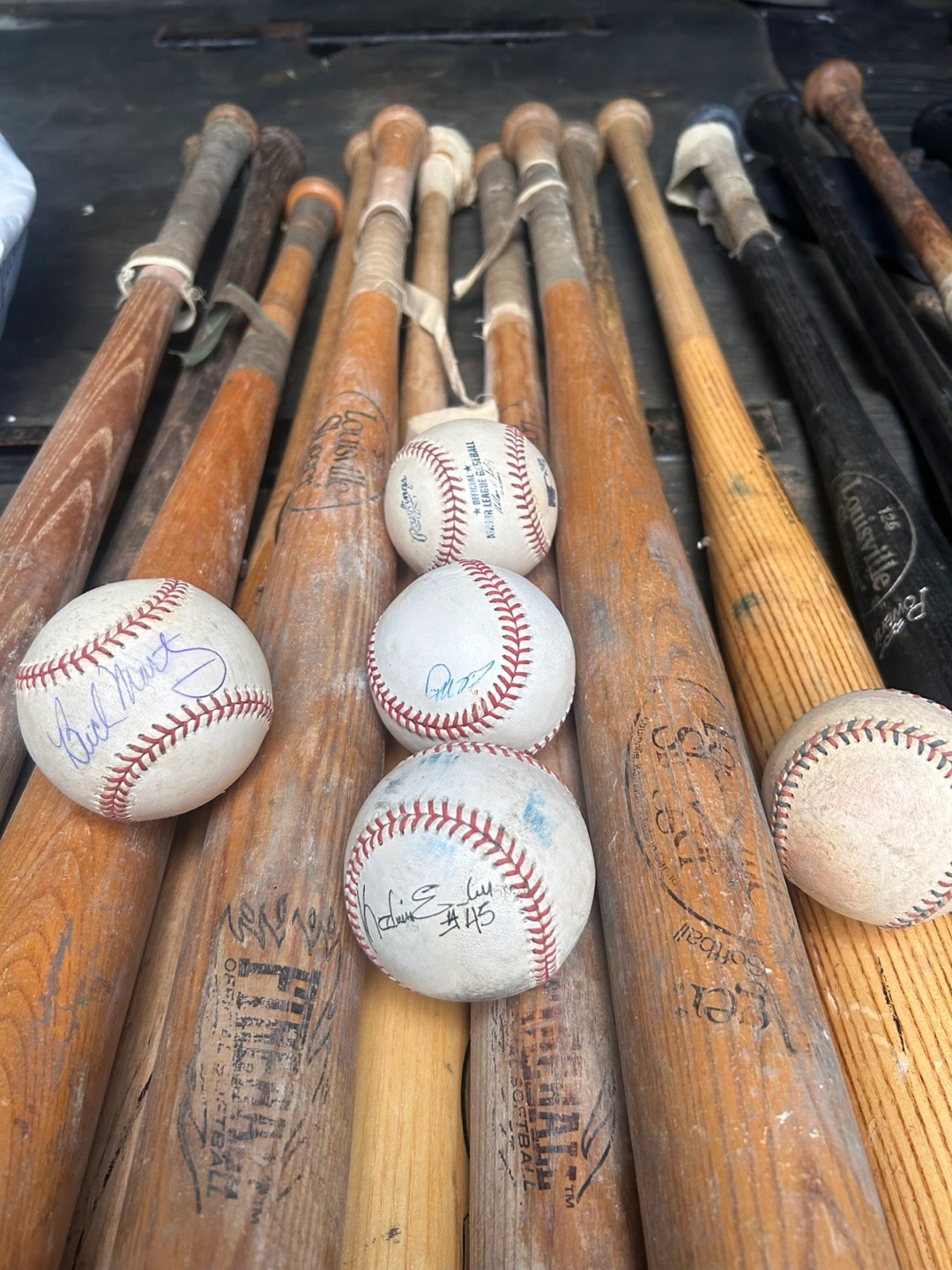 I'm selling a collection of used baseball bats and signed baseballs. The bats are a mix of different brands and styles, showing signs of wear from use. The baseballs have various signatures, adding a unique touch. Perfect for collectors or baseball enthusiasts!
