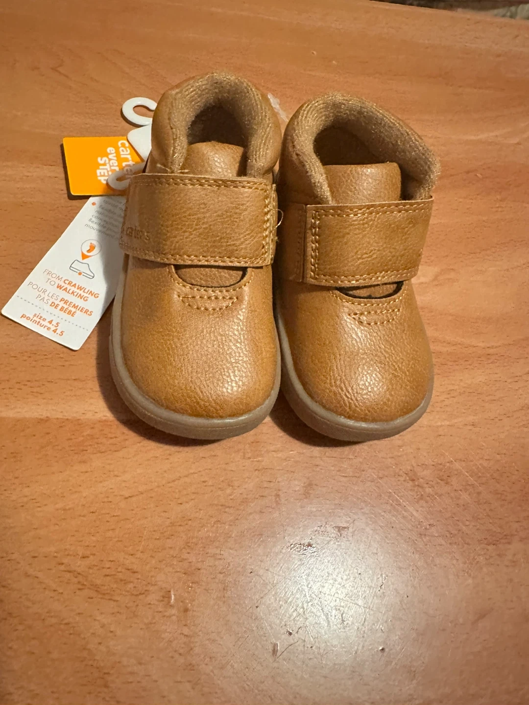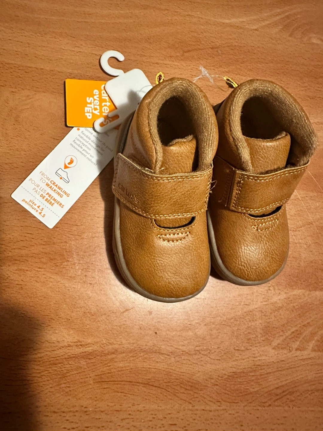 These adorable Carter's baby boots are brand new with tags! They are a size 4.5 and perfect for little ones transitioning from crawling to walking. Originally bought for $36.00, they're a steal!