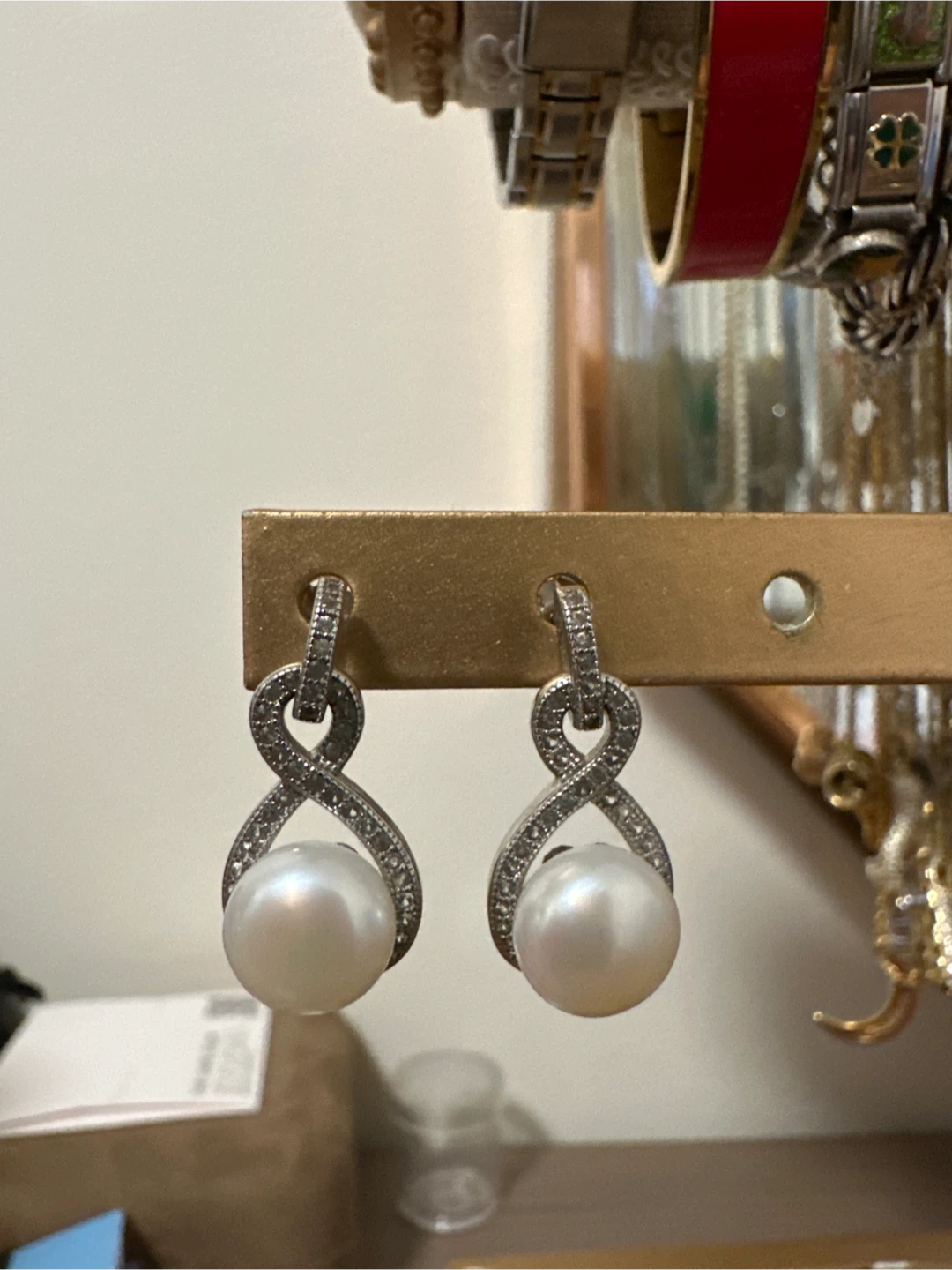 These are a beautiful pair of drop earrings featuring a pearl suspended within a decorative, possibly pave-set, design. They would make a lovely addition to any jewelry collection!