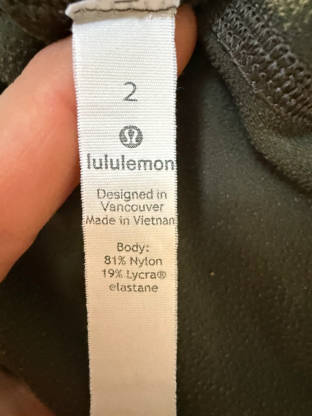 Selling a pair of Lululemon leggings in a lovely olive green colour. They are size 2 and made of 81% nylon and 19% Lycra elastane. Designed in Vancouver, these leggings are perfect for workouts or everyday wear