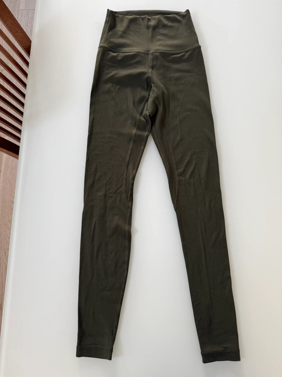 Selling a pair of Lululemon leggings in a lovely olive green colour. They are size 2 and made of 81% nylon and 19% Lycra elastane. Designed in Vancouver, these leggings are perfect for workouts or everyday wear