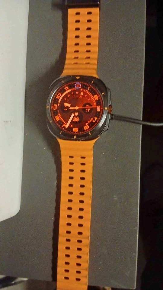 The Samsung Watch Ultra features a 1.47" or 1.5" display, the Exynos W1000 processor, 2GB of RAM, and 32GB or 64GB of storage. It includes a 590mAh battery, offers advanced connectivity options like LTE, Wi-Fi, and GPS, and has a durable titanium casing with a 10 ATM water resistance rating. Display Size: 1.47" or 1.5"Resolution: (480x480) pixelsPPI: 327 PPI Performance and storage Processor: Exynos W1000 (3 nm)RAM: 2GBInternal storage: 32GB or 64GBExpandable memory: No Battery Capacity: 590mAhCharging: 10WBattery life: Up to 100 hours in power-saving mode Connectivity Wireless: Bluetooth 5.3, Wi-Fi 2.4 GHz & 5 GHzLocation: Dual GPSOther: NFC, LTE Durability and design Case: TitaniumWeight: Approximately 60.5gDimensions: (45.4x45.4x10.5mm)Water resistance: 10 ATMOperating temperature: Can withstand temperatures from (-20^{\circ }C) to (55^{\circ }C) Other features Operating System: Wear OS 5 with One UI Watch 6Health sensors: Enhanced BioActive Sensor for heart rate monitoringOther: eSIM