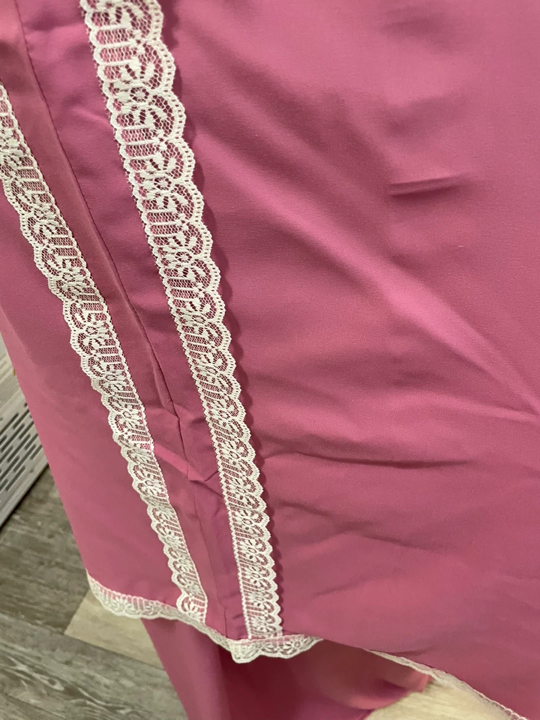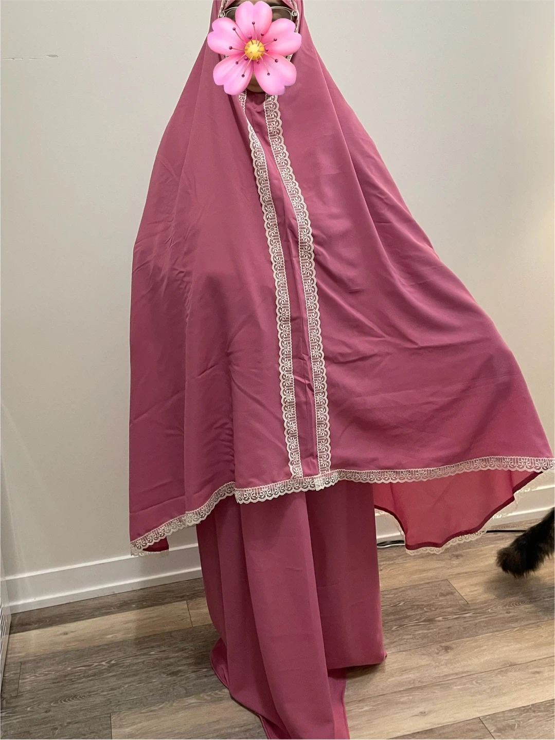Selling a pink prayer outfit with delicate lace trim. It's in great condition and ready for use. The fabric is soft and comfortable, perfect for daily prayers