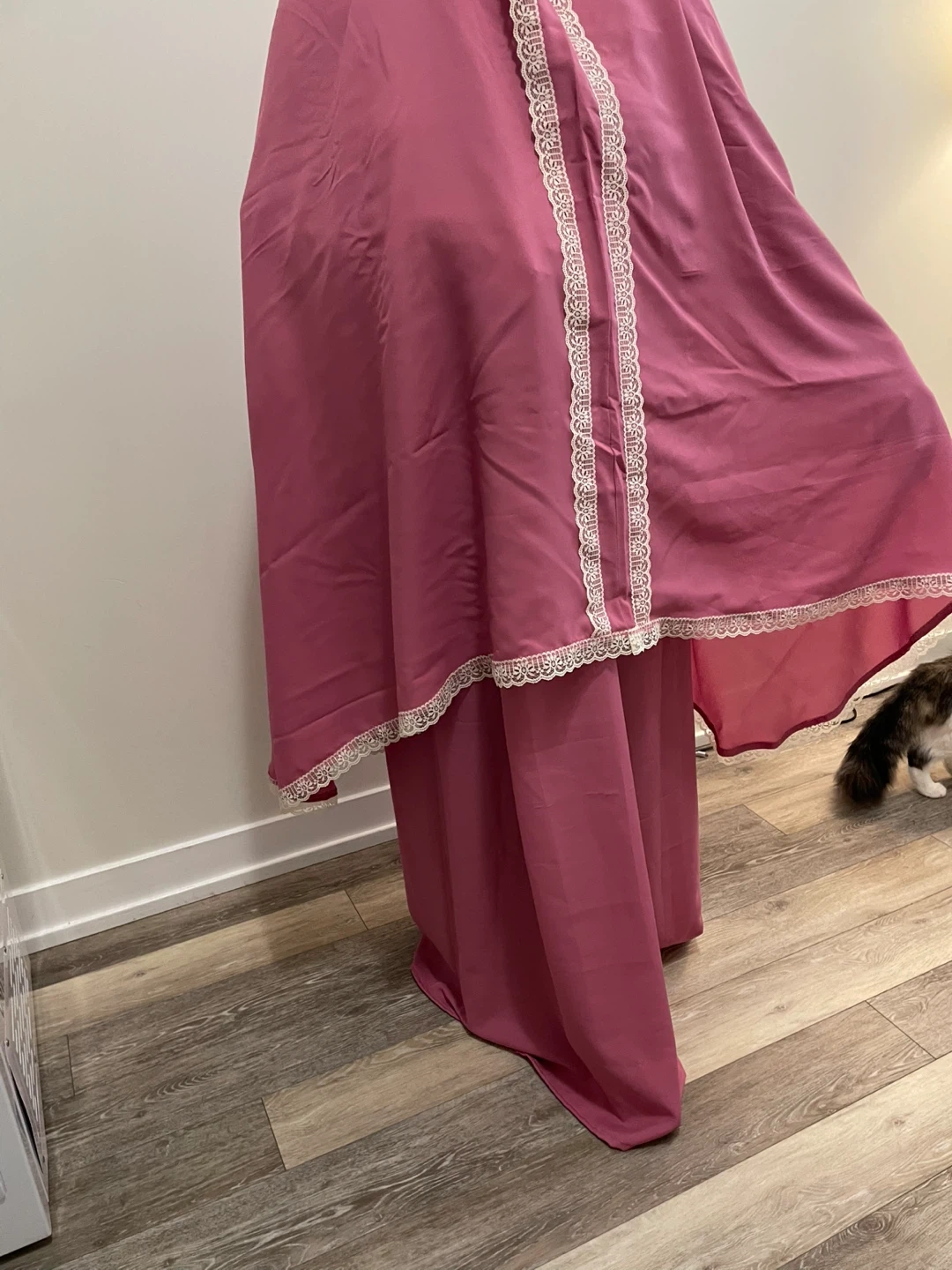 Selling a pink prayer outfit with delicate lace trim. It's in great condition and ready for use. The fabric is soft and comfortable, perfect for daily prayers