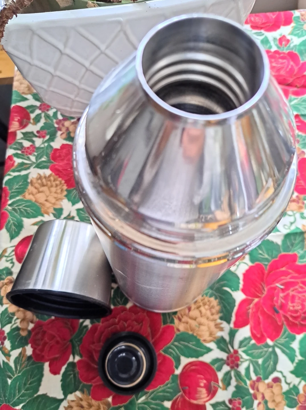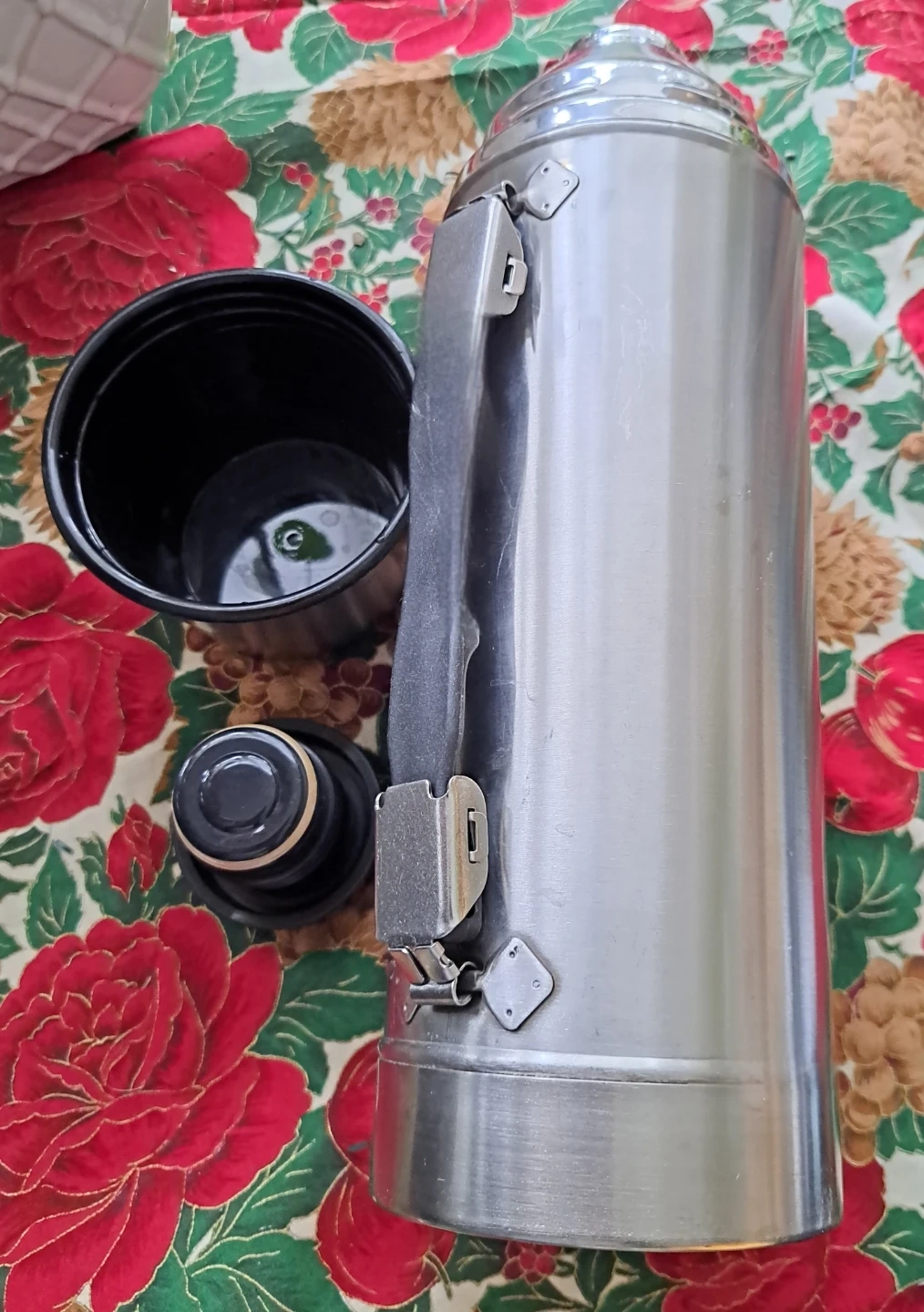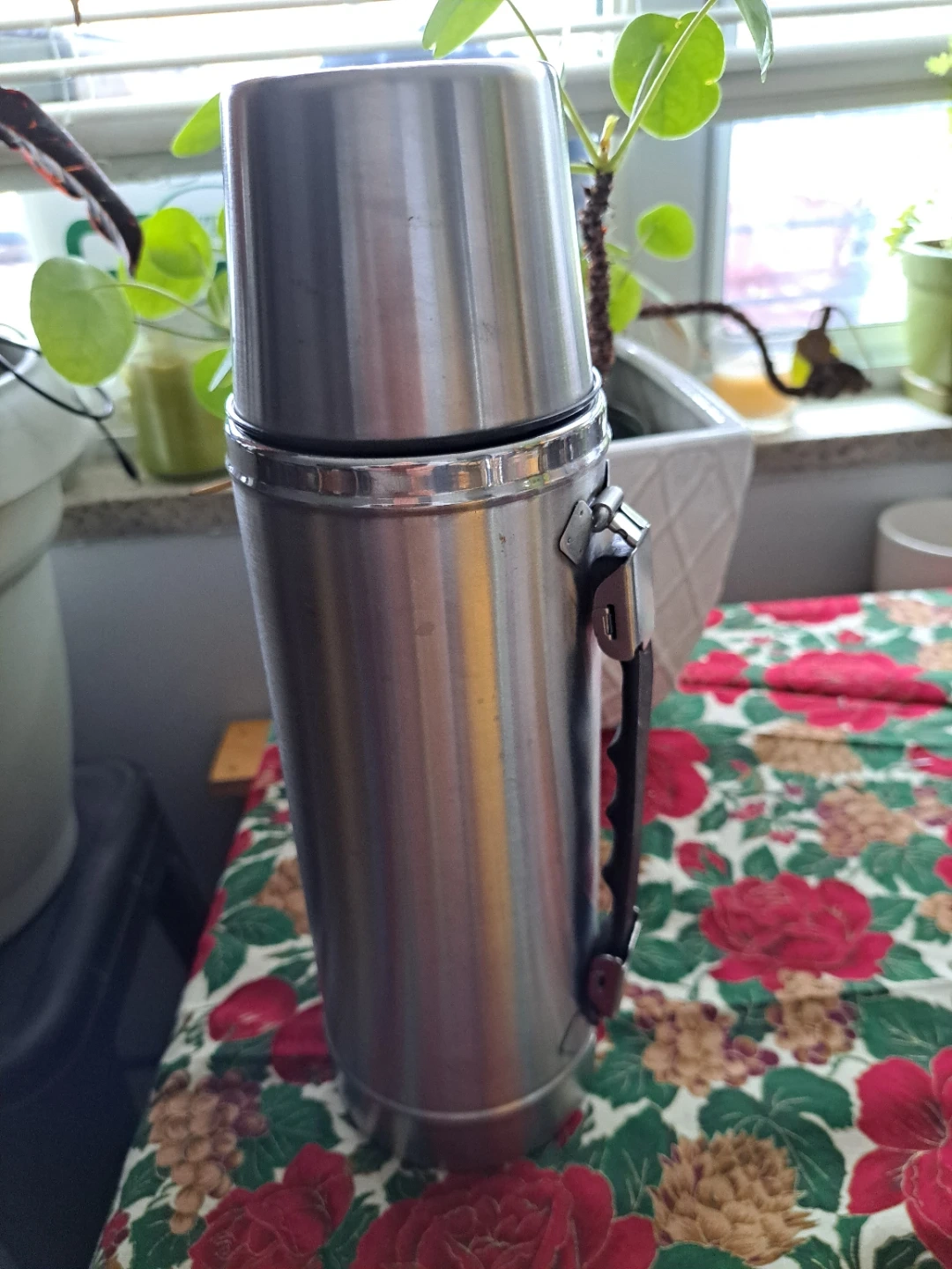 Stainless steel thermos! It's in excellent, barely used shape and ready to keep your drinks hot or cold. Perfect for camping, picnics, or just keeping at home. It comes with the cup lid and stopper.