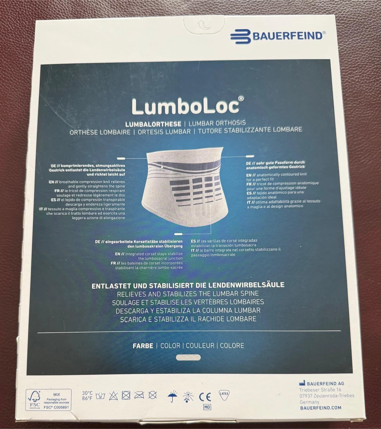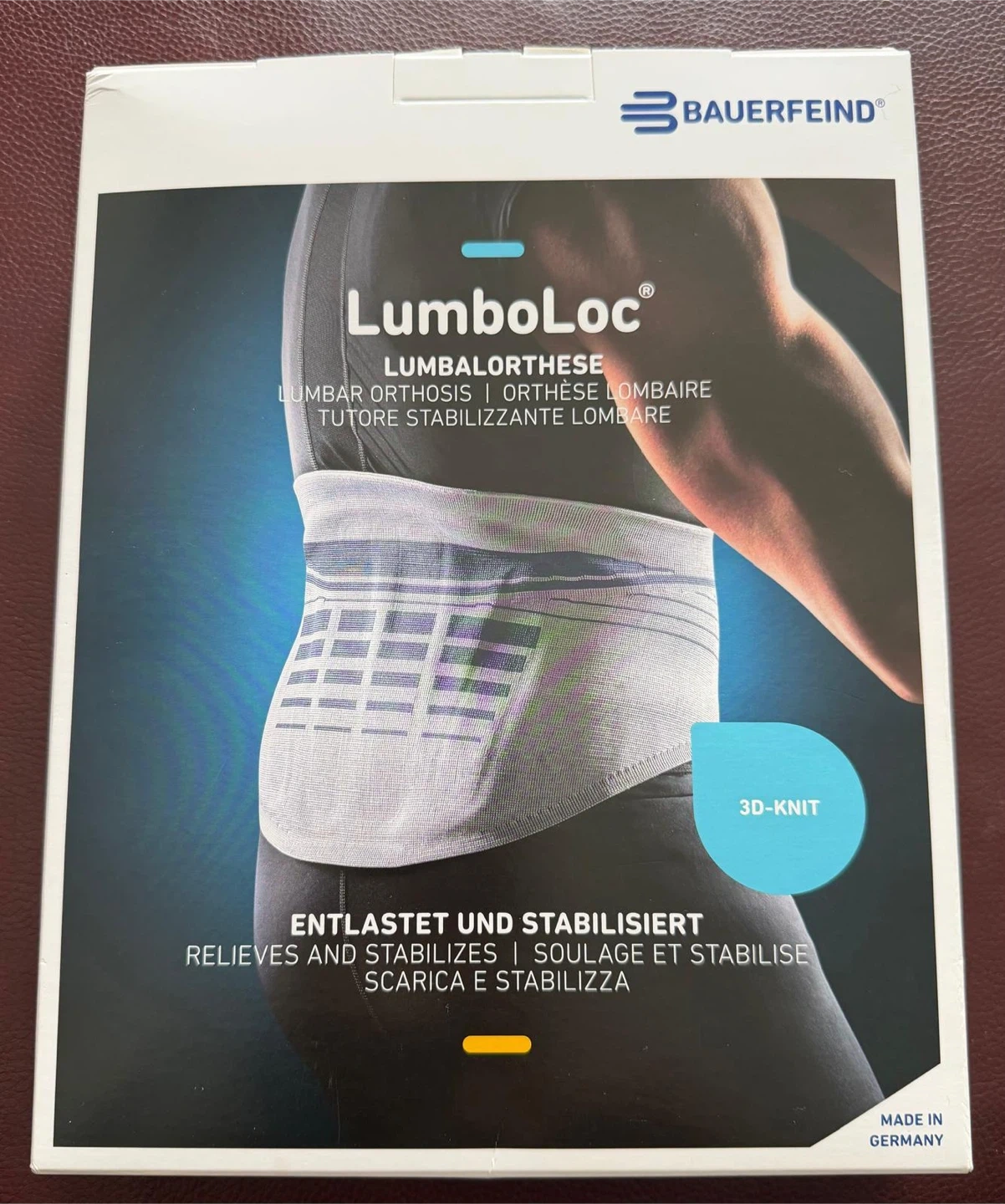 I'm selling a Bauerfeind LumboLoc lumbar orthosis. It helps to relieve and stabilize the lumbar spine. This is a lumbar orthosis or orthèse lombaire. It's made in Germany.