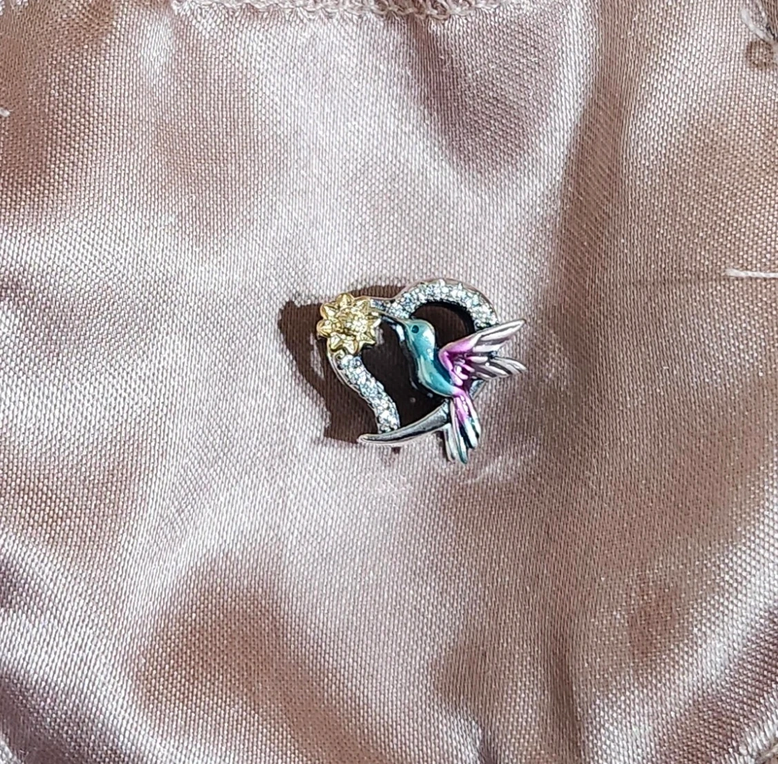 A lovely charm featuring a hummingbird and heart design! The hummingbird has vibrant blue and pink colours, and the heart is adorned with sparkling accents.