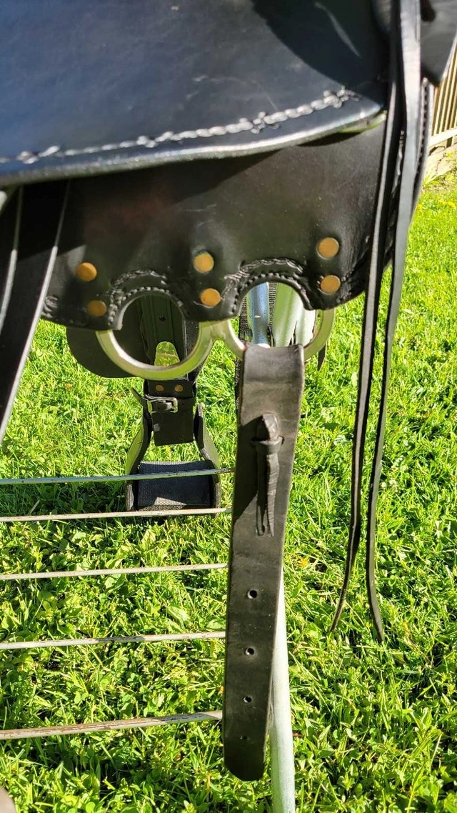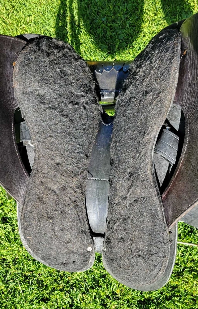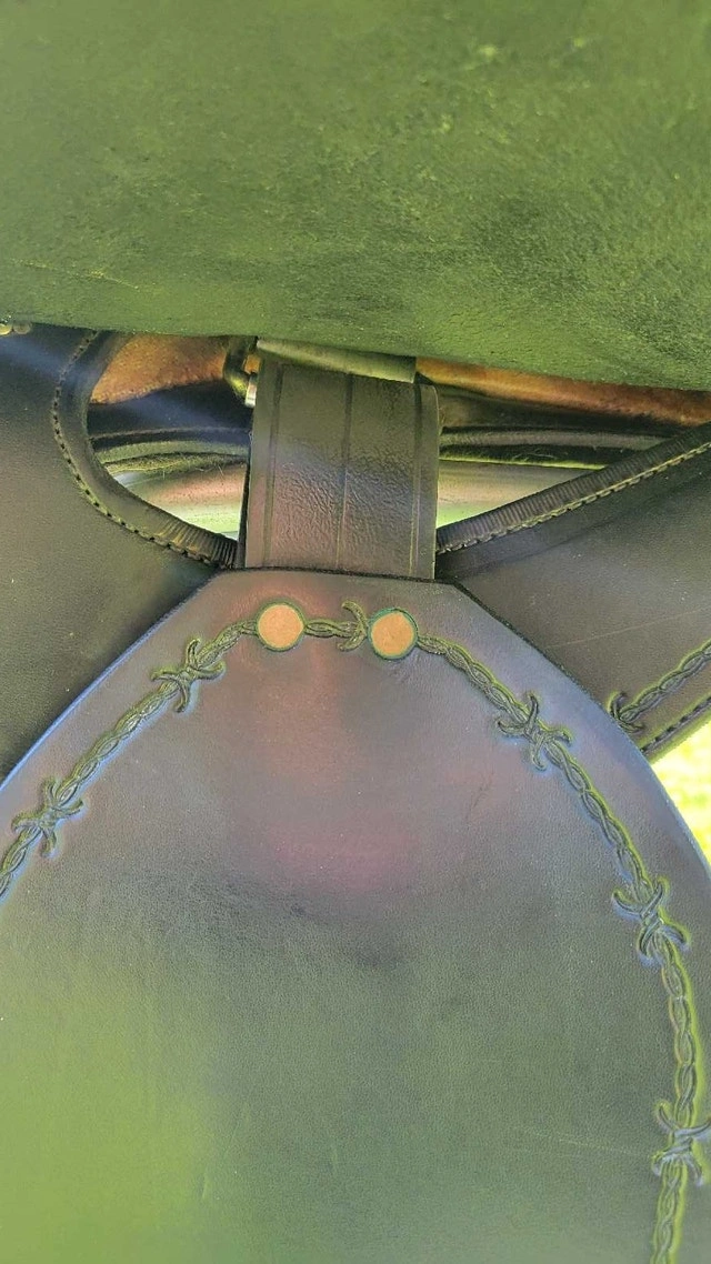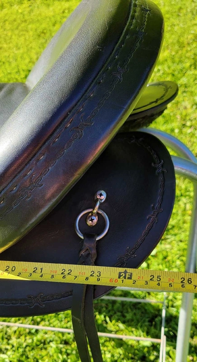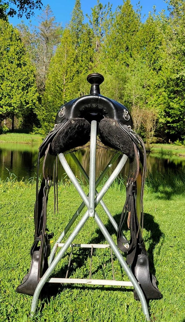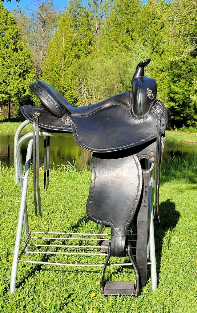 Absolutely beautiful and very comfortable saddle with buttery-soft leather, very high quality made by Jay's Custom Saddlery in Monterey Tennessee. 16" seat with 25" overall skirt length, fits a wide variety of equines except those with super straight backs and mutton withers. Features: * Thinner bars for closer contact with relief channels for better leg movement; * Custom designed bar for better shoulder and wither relief allowing for better performance; * Full Grain Hermann Oak Leather; * Saddle Tree is Kiln-dried yellow poplar wood covered in Fiberglass, which is lighter than pine and provides more strength & durability. This saddle has seen very little use and has been meticulously cared for in it's short life. Measurements in photos. Trials available with full payment up front and full refund if it doesn't fit (provided it returns in the same condition). Pick up near Stayner.