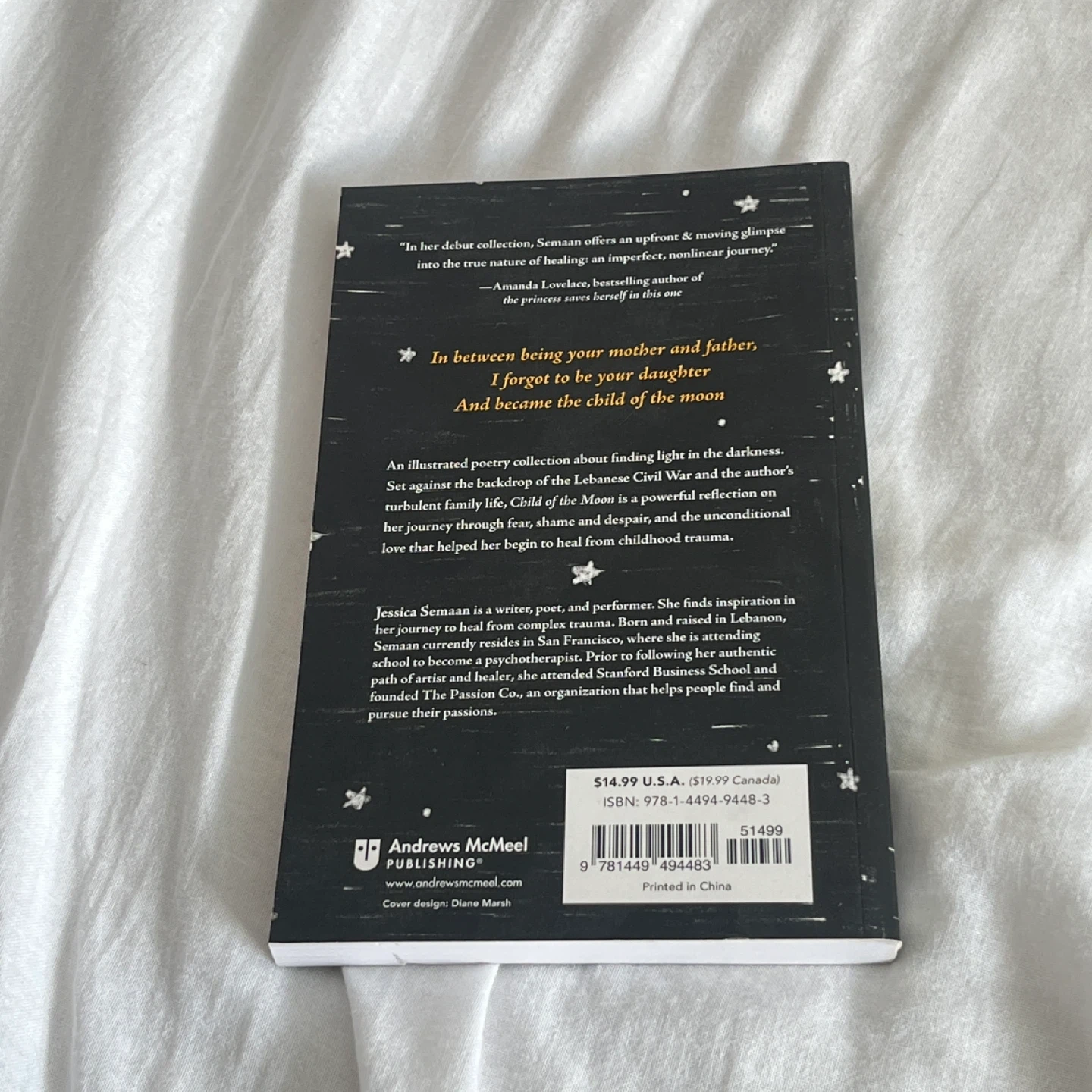 Selling a copy of "Child of the Moon" by Jessica Semaan! It's a poetry collection that explores themes of family, trauma, and healing. A powerful reflection on a journey through despair and unconditional love