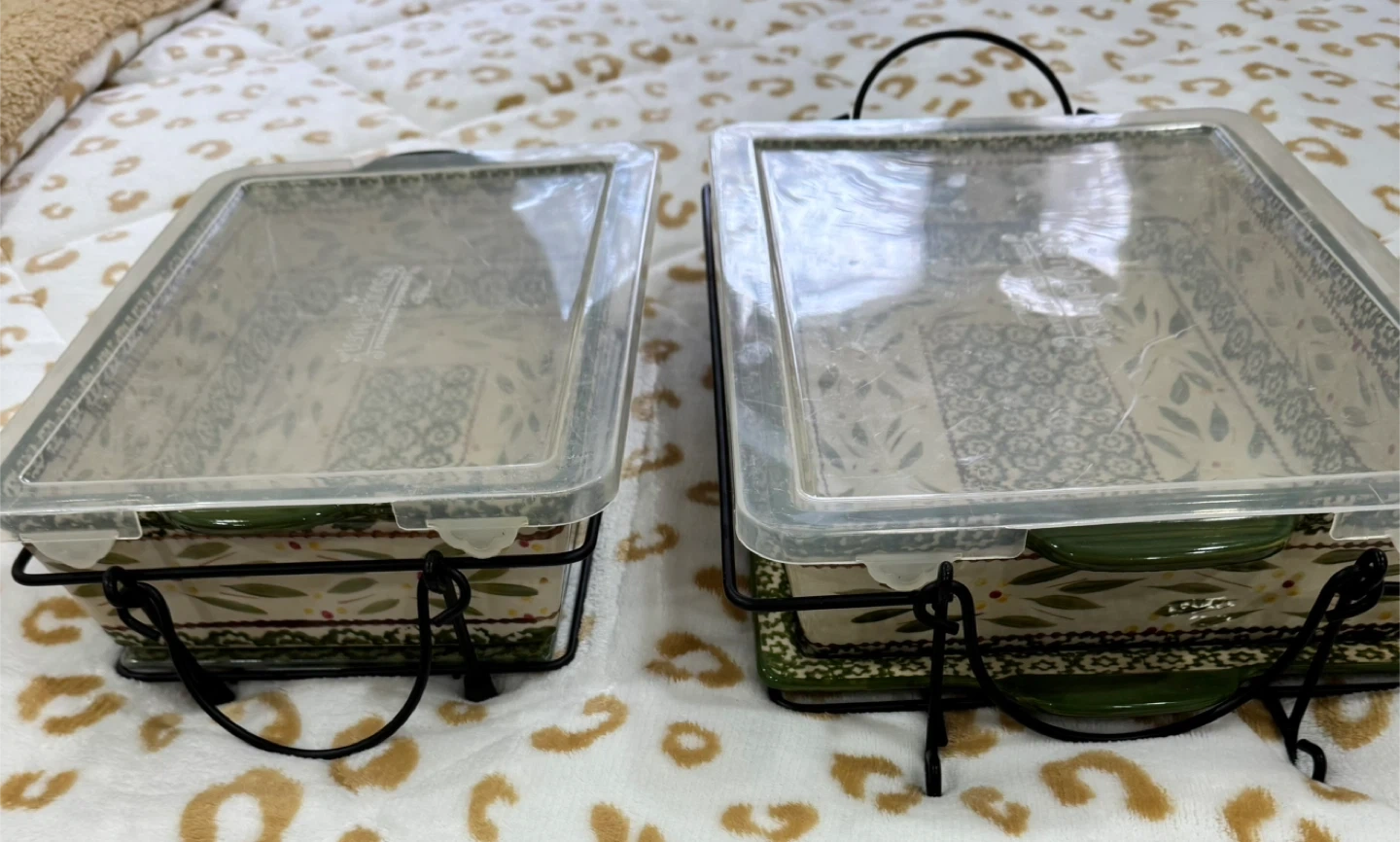Selling a set of two baking dishes from The Pioneer Woman. They come with lids and metal racks. Perfect for casseroles or desserts!