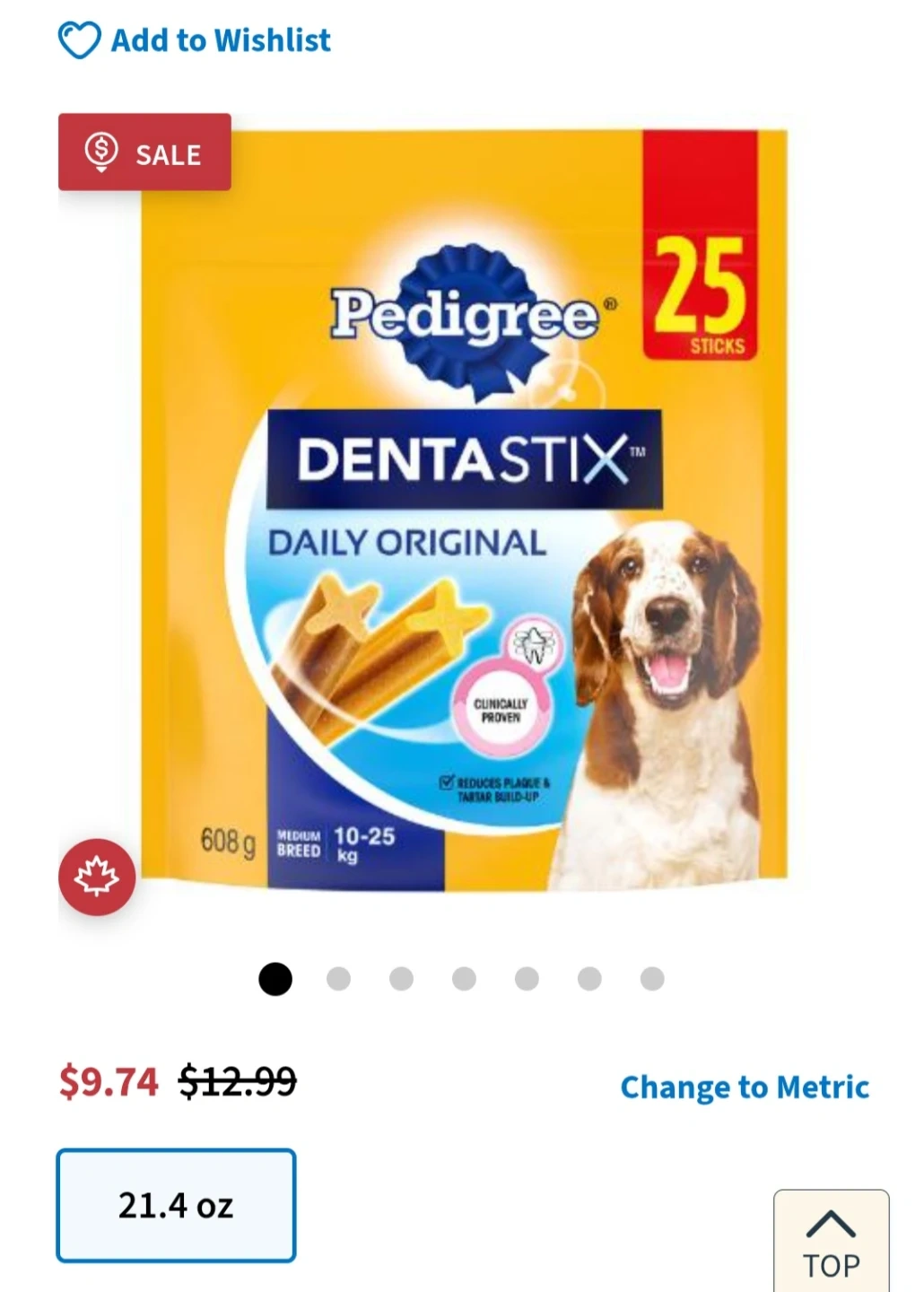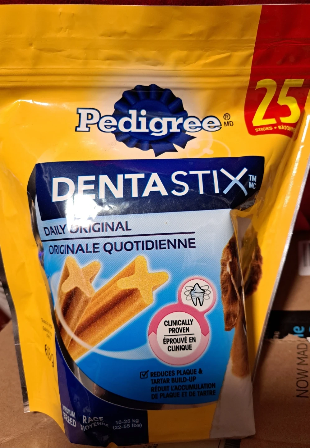 Pedigree Dentastix Daily Original dog treats. These treats are clinically proven to reduce plaque and tartar buildup. They also have no added sugar and are low in fat.