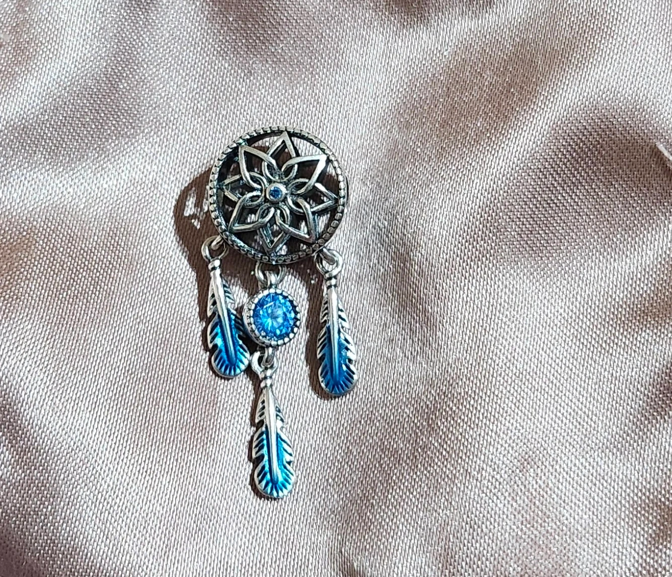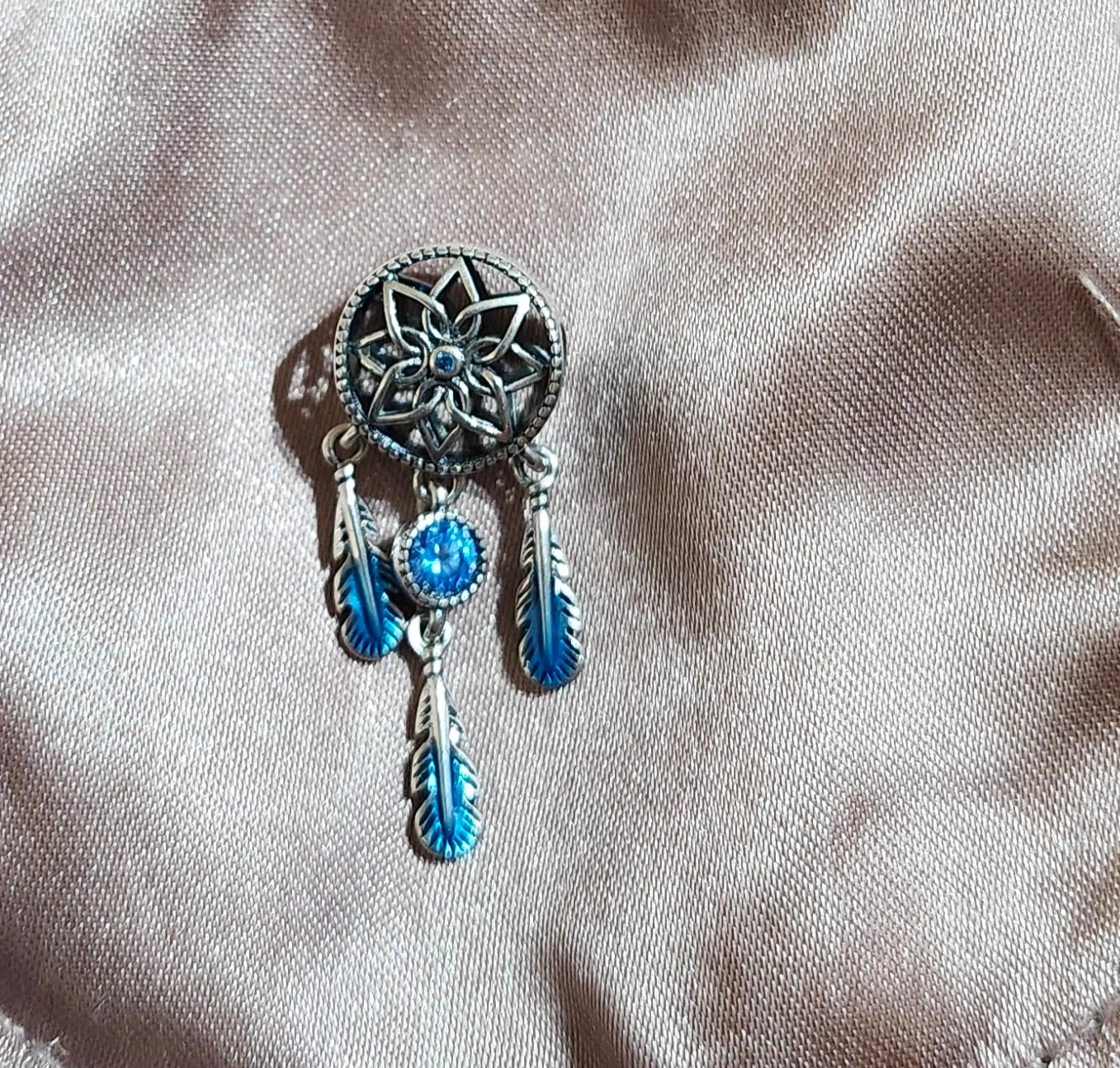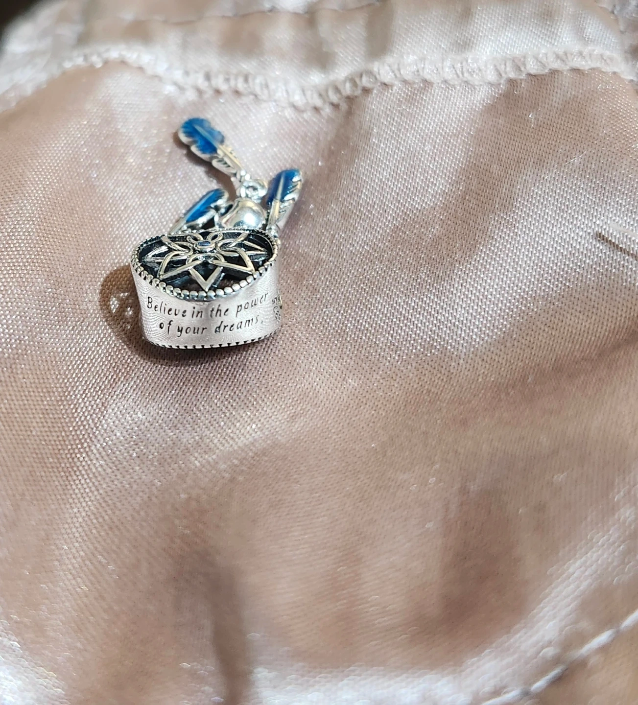 This is a beautiful charm featuring a dreamcatcher design. It's ready to add a touch of whimsy to your bracelet or necklace! The charm has intricate details and a lovely blue stone accent. Says belive in the power of your dreams