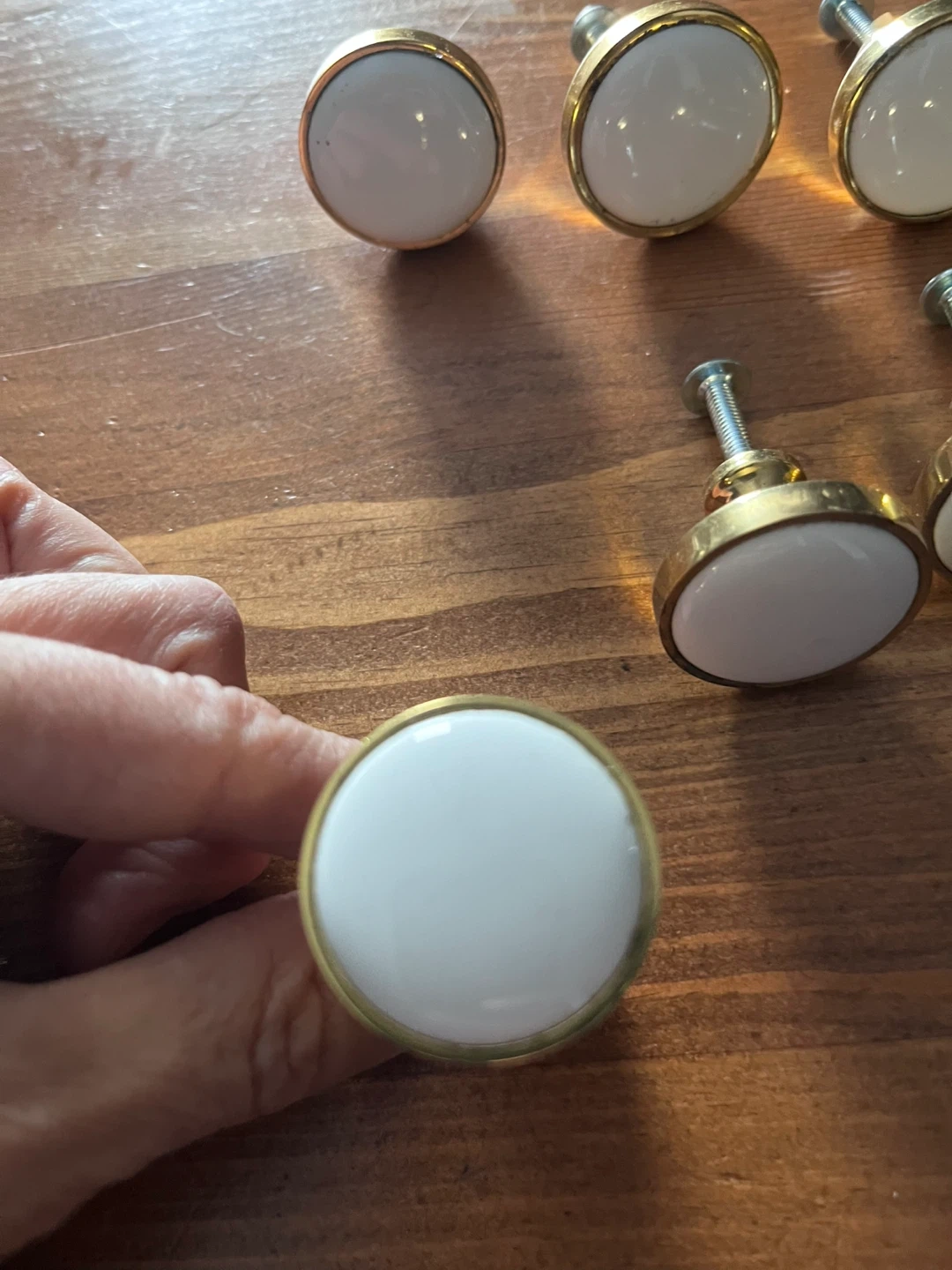 Selling a set of 10 Lee Valley Belwith Solid Brass Round Knobs. These feature a polished brass finish with a white centre. Originally bought for $3.50 each.