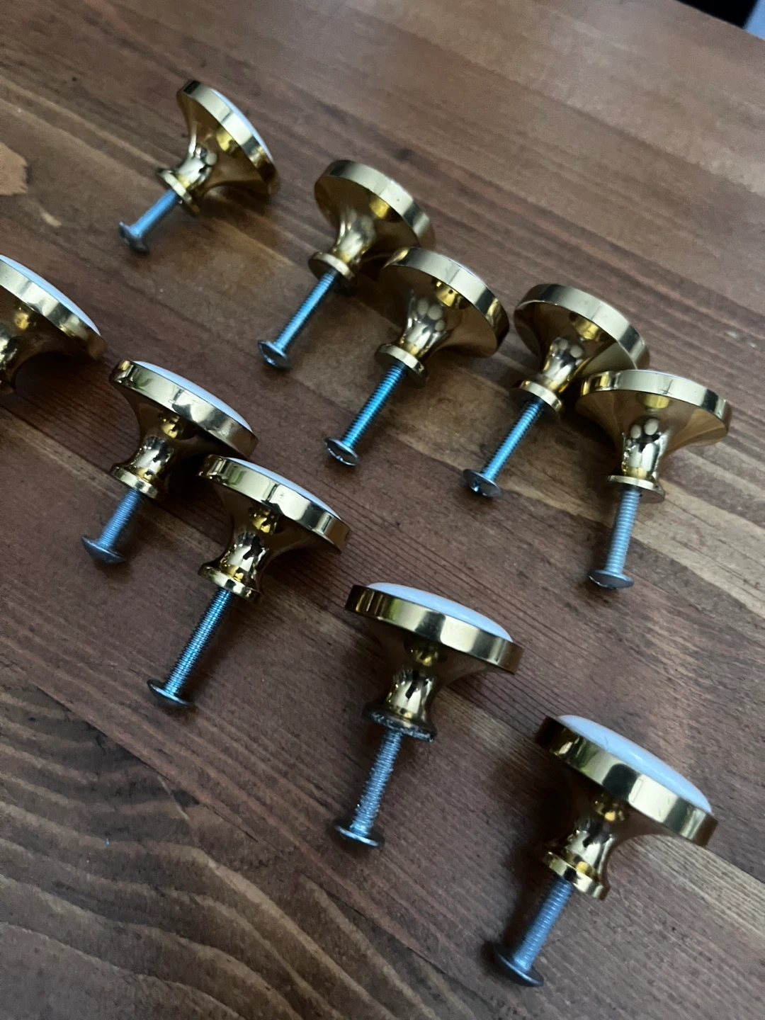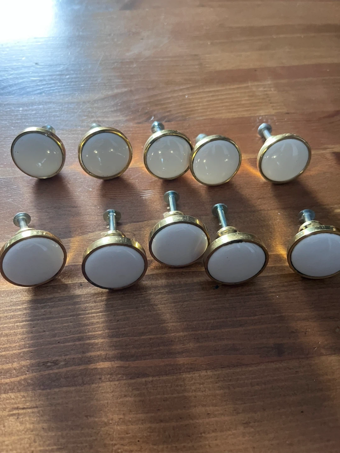 Selling a set of 10 Lee Valley Belwith Solid Brass Round Knobs. These feature a polished brass finish with a white centre. Originally bought for $3.50 each.