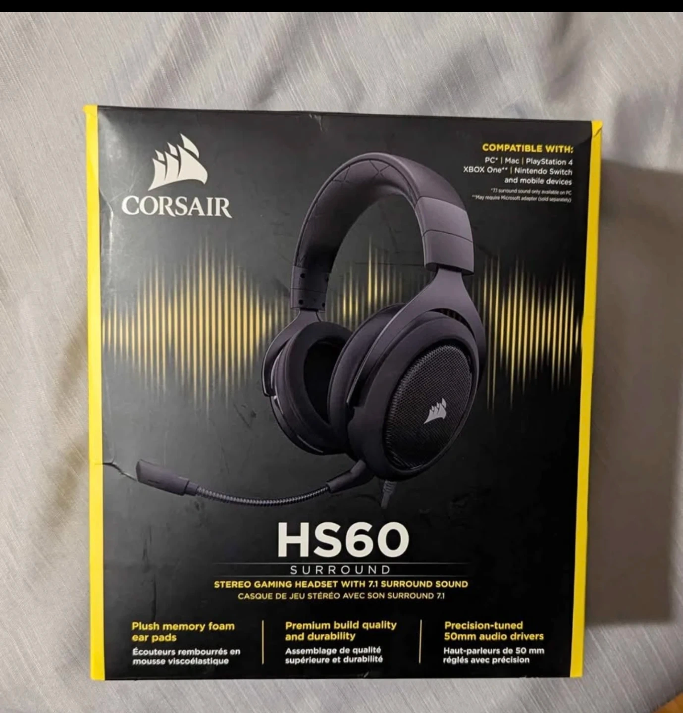 Selling a brand new Corsair HS60 Surround gaming headset! It's still in its original box and has never been used. Enjoy immersive 7.1 surround sound for a great gaming experience. Includes plush memory foam ear pads and precision-tuned 50mm audio drivers. Compatible with PC, Mac, PlayStation 4, Xbox One, Nintendo Switch, and mobile devices. Box is included!
