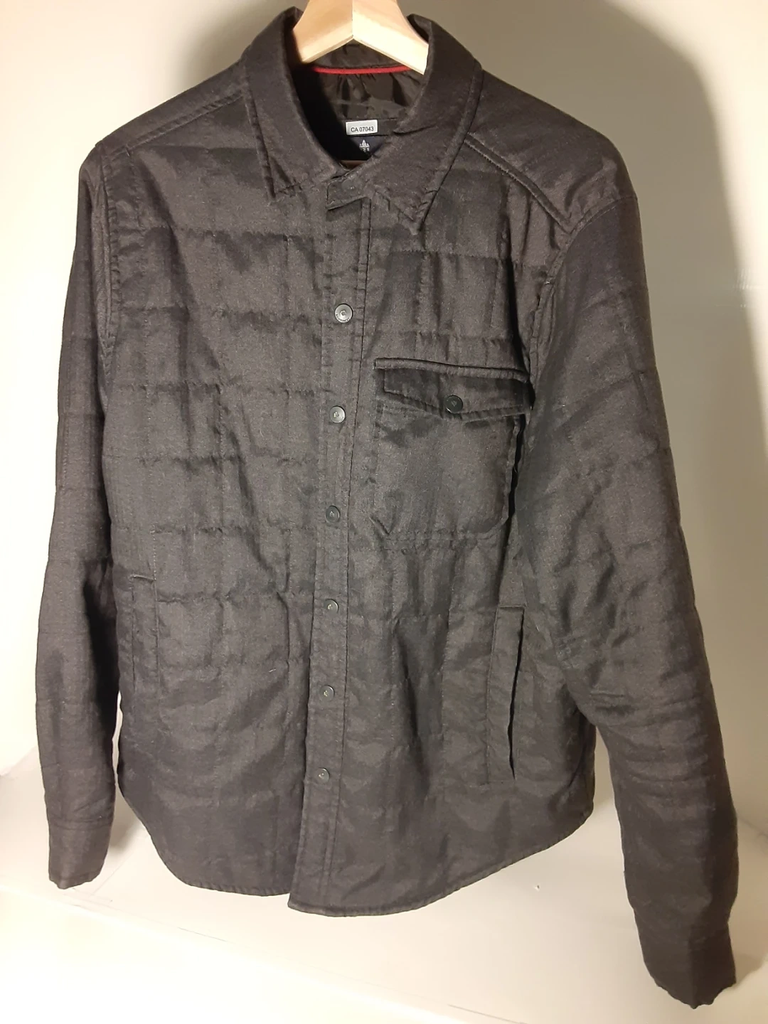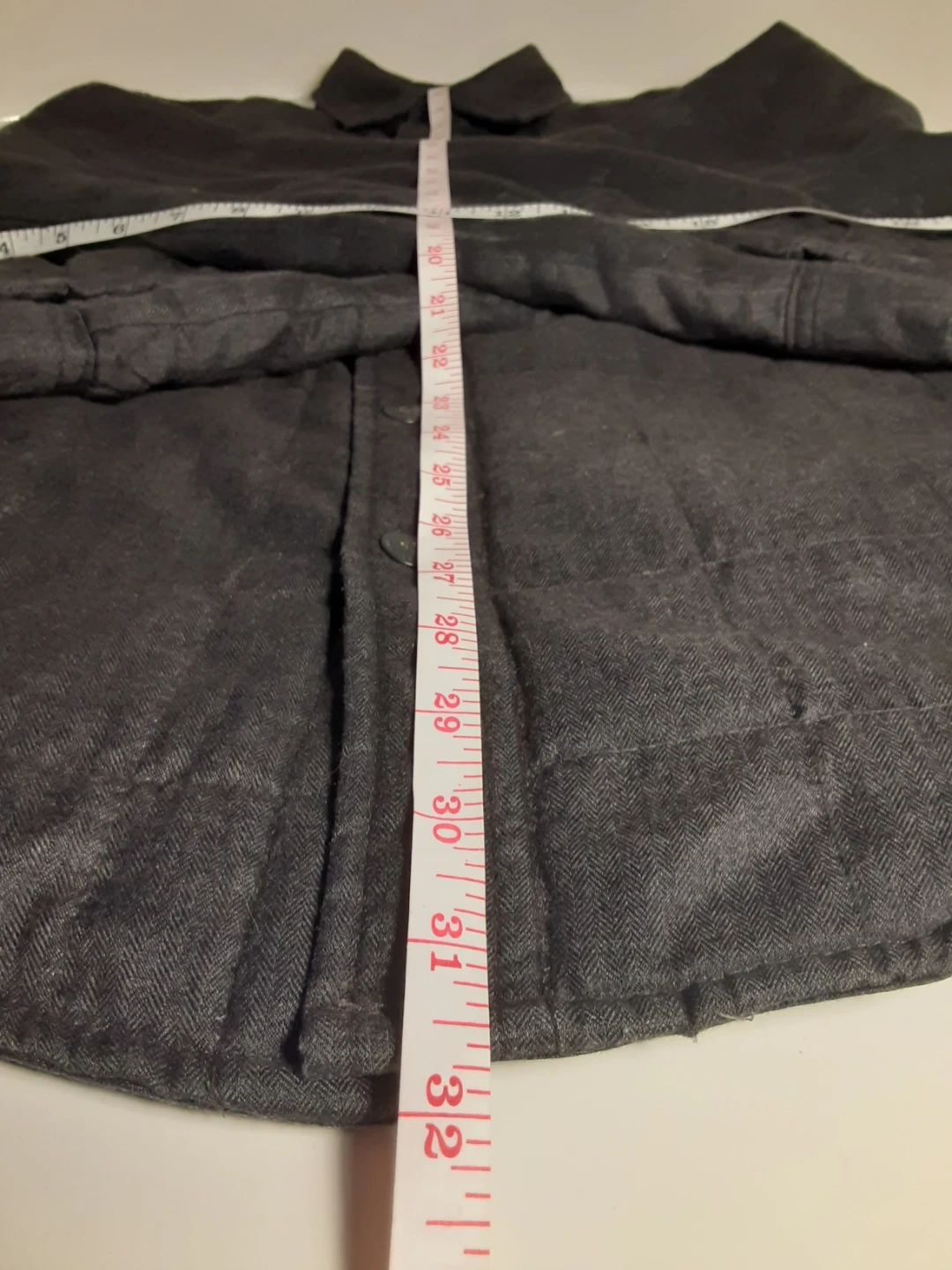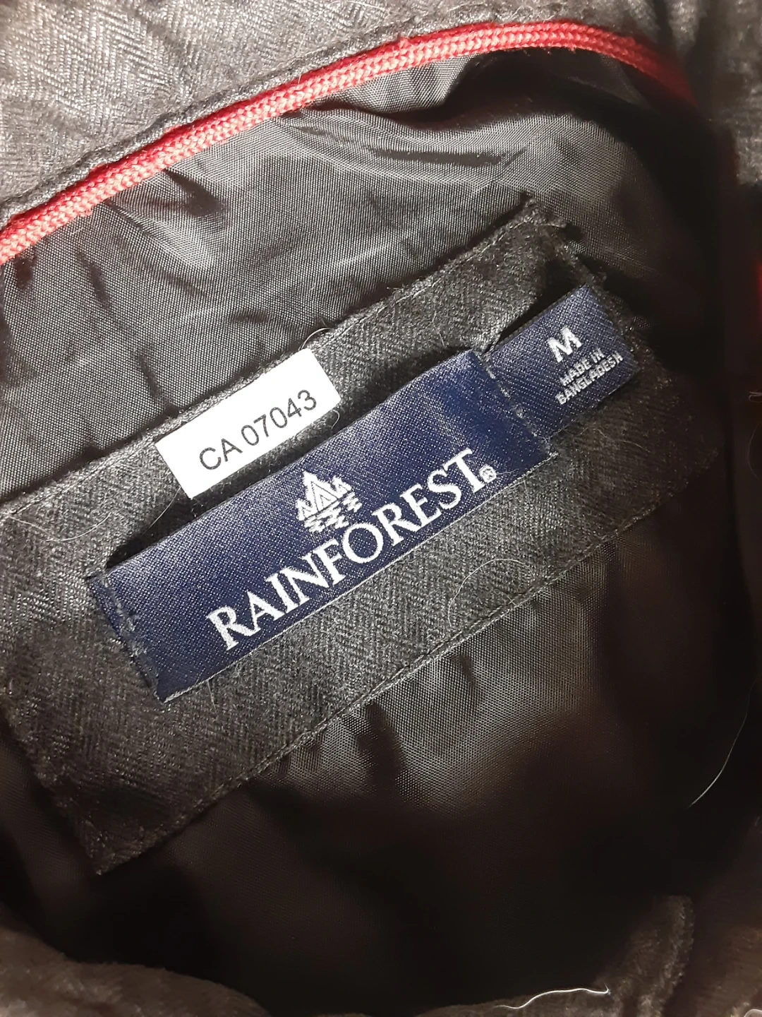 Rainforest - dark grey light quilted button up jacket(100% Polyester) in size medium! It's a stylish and comfortable piece, perfect for layering. Has a front button up top pocket and 2 standard side pockets, with no internal pockets. Shows sign of use/wear(mainly the buttons) but is still in good condition.