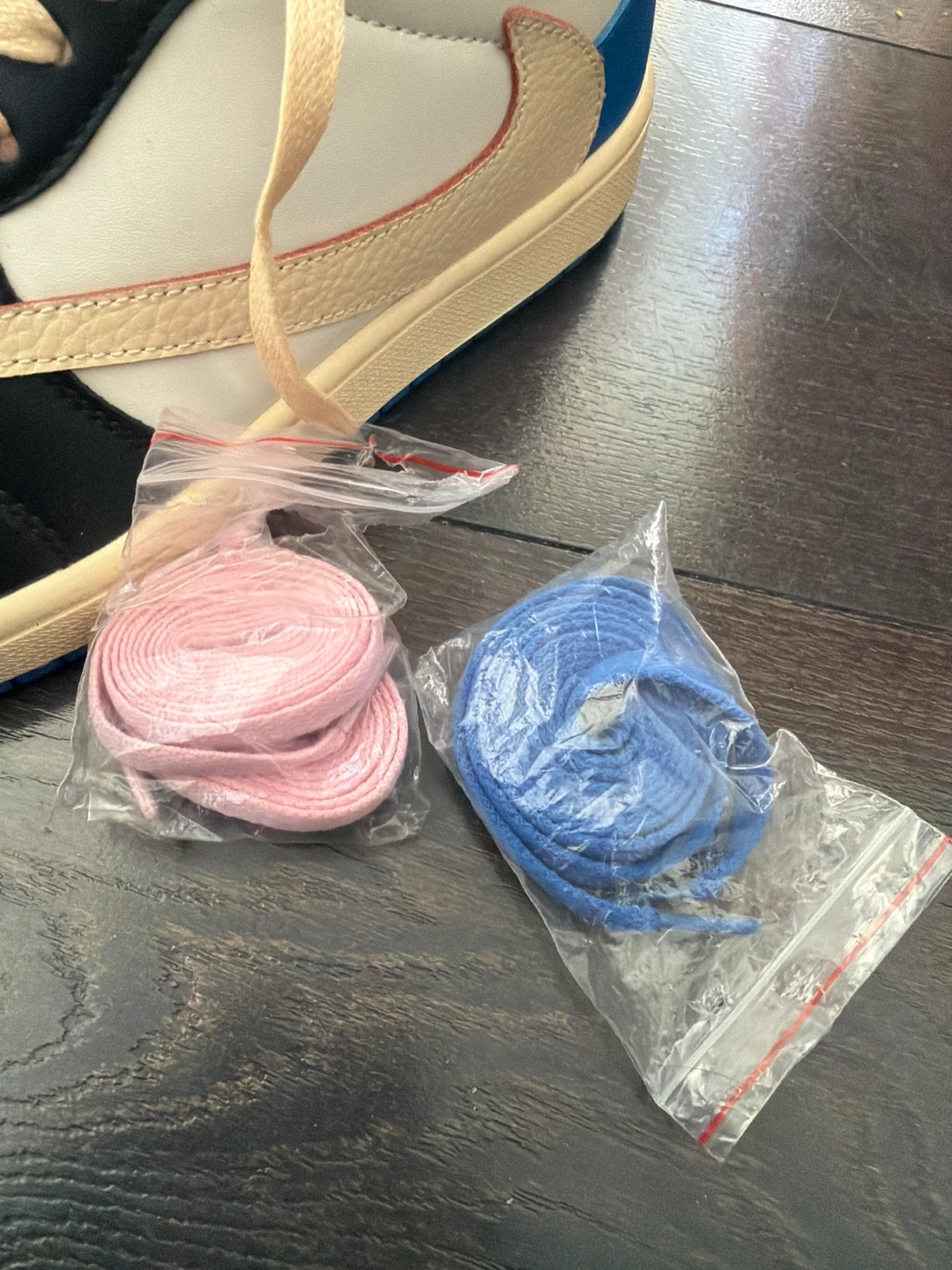 Selling a pair of Air Jordan 1 Low Travis Scott Fragment shoes. They come with extra laces in pink and blue. These are in great condition and ready for a new owner!