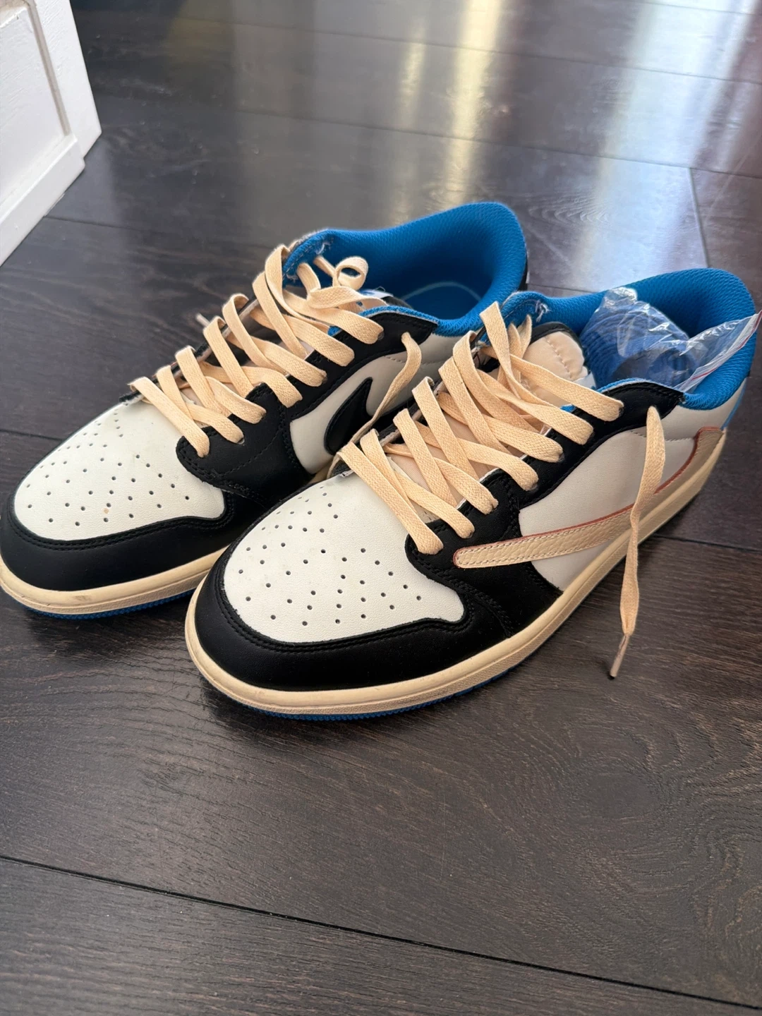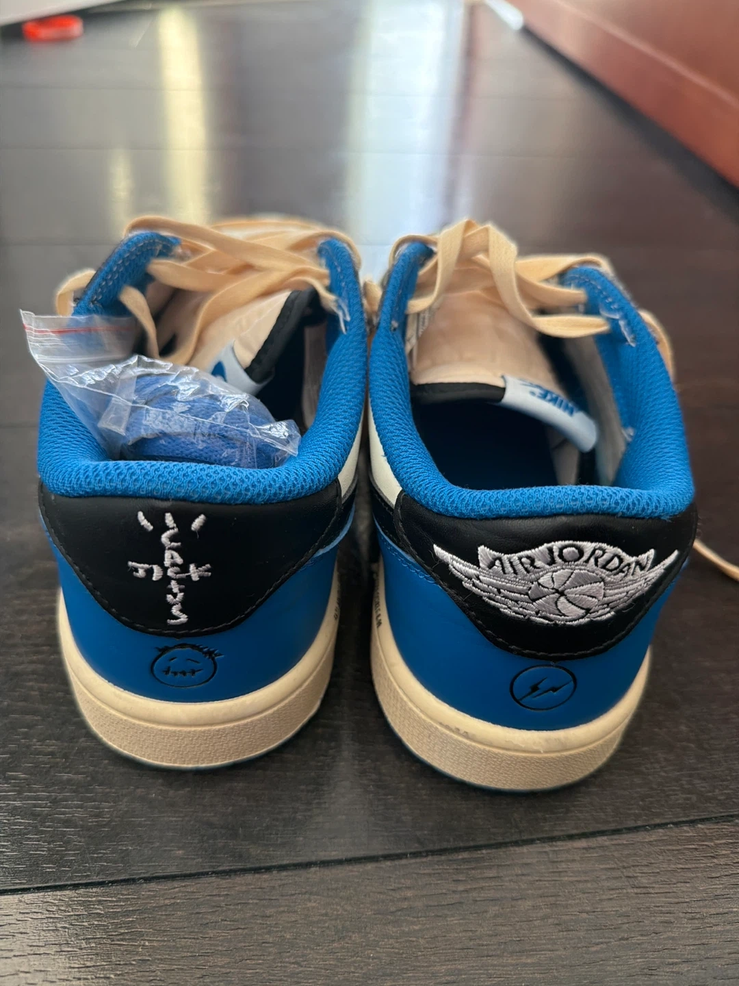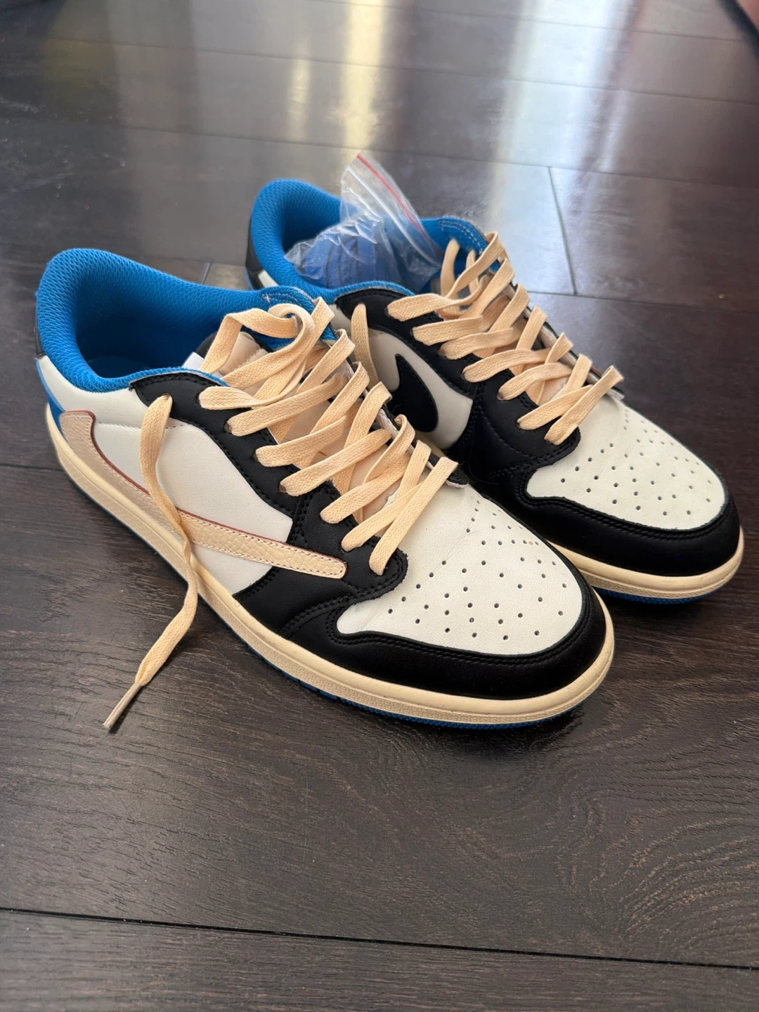 Selling a pair of Air Jordan 1 Low Travis Scott Fragment shoes. They come with extra laces in pink and blue. These are in great condition and ready for a new owner!