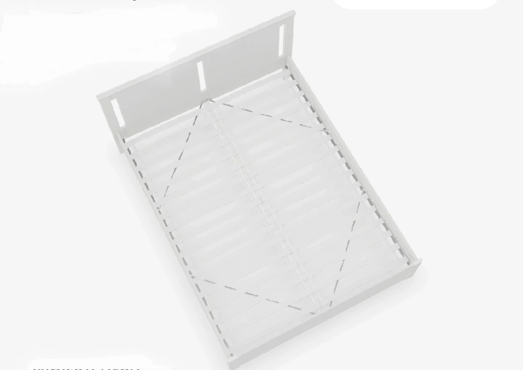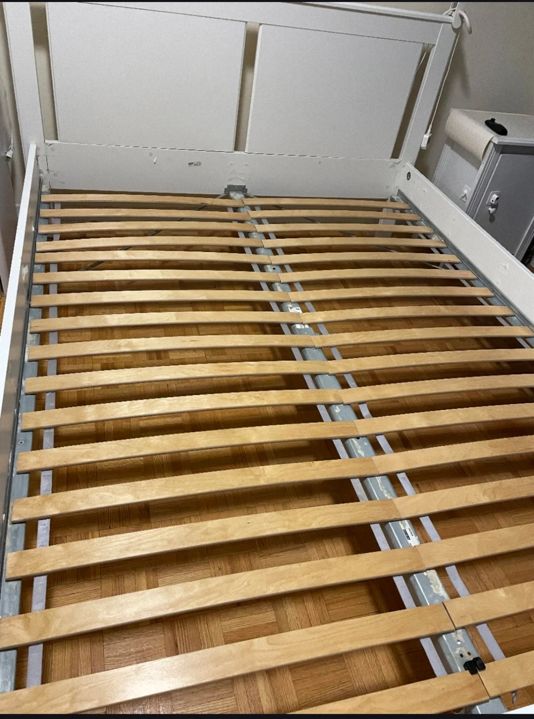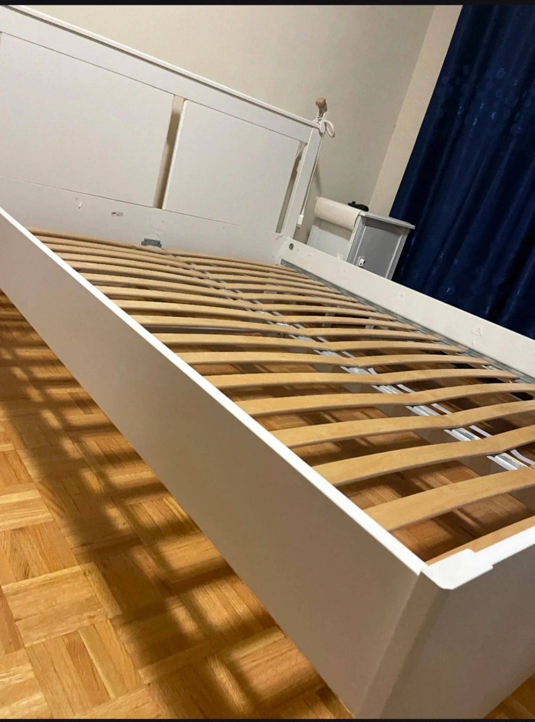 Selling a white bed frame. It's in great shape and ready for a new home. The dimensions are approximately 165 cm wide and 208 cm long. The headboard is 95 cm tall. Perfect for a queen-sized mattress!