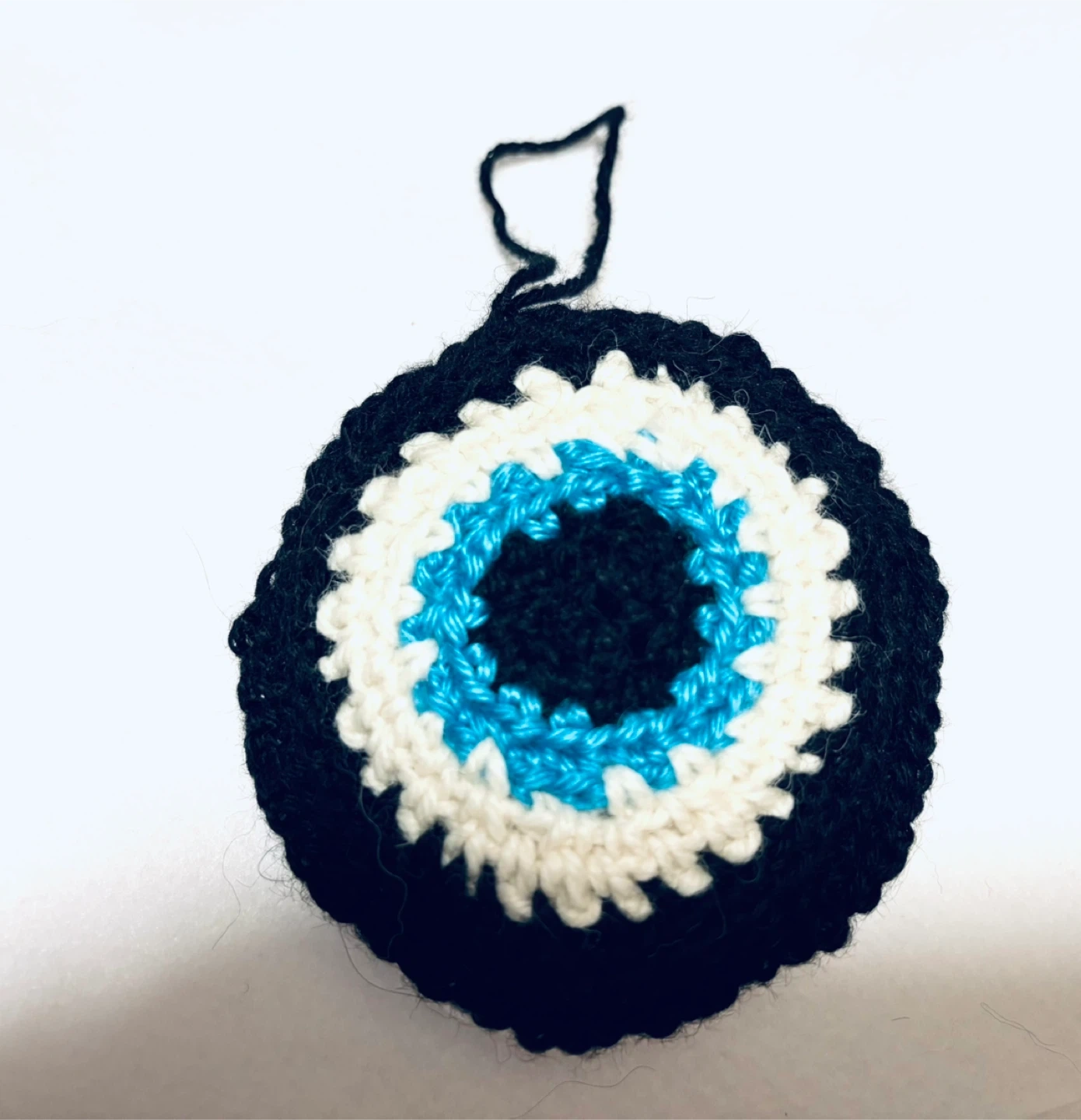 Selling a handmade crochet evil eye amulet. This cute and protective charm is perfect for adding a touch of folk art to your home or or car as a thoughtful gift. The amulet features a concentric design in black, white, and blue yarn, creating a vibrant and eye-catching piece. Good luck π