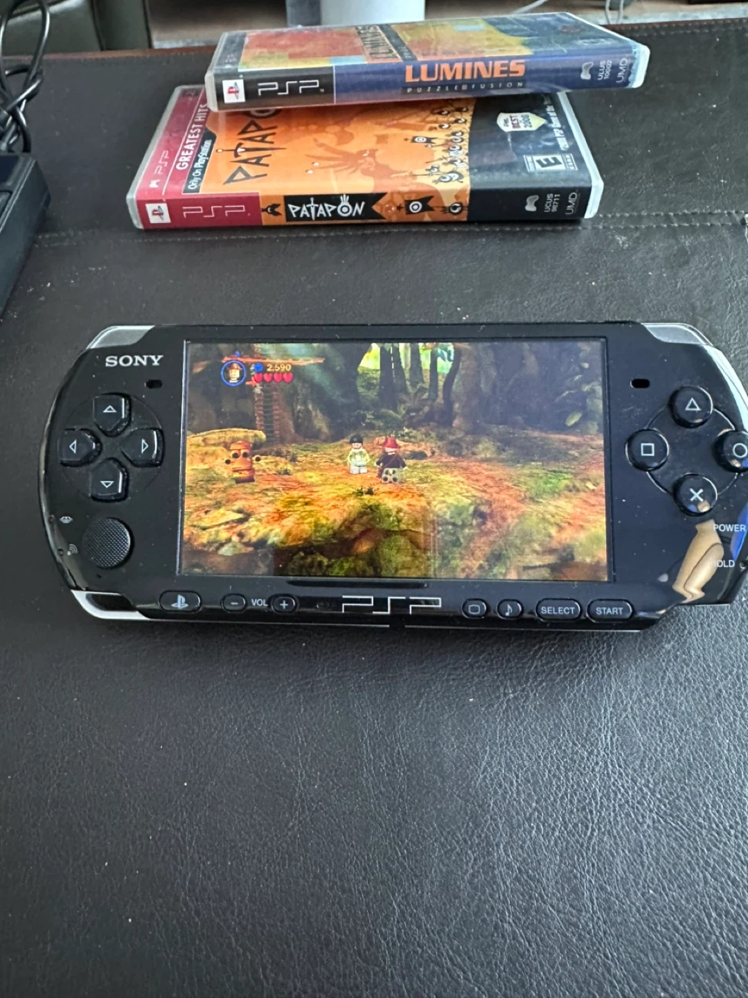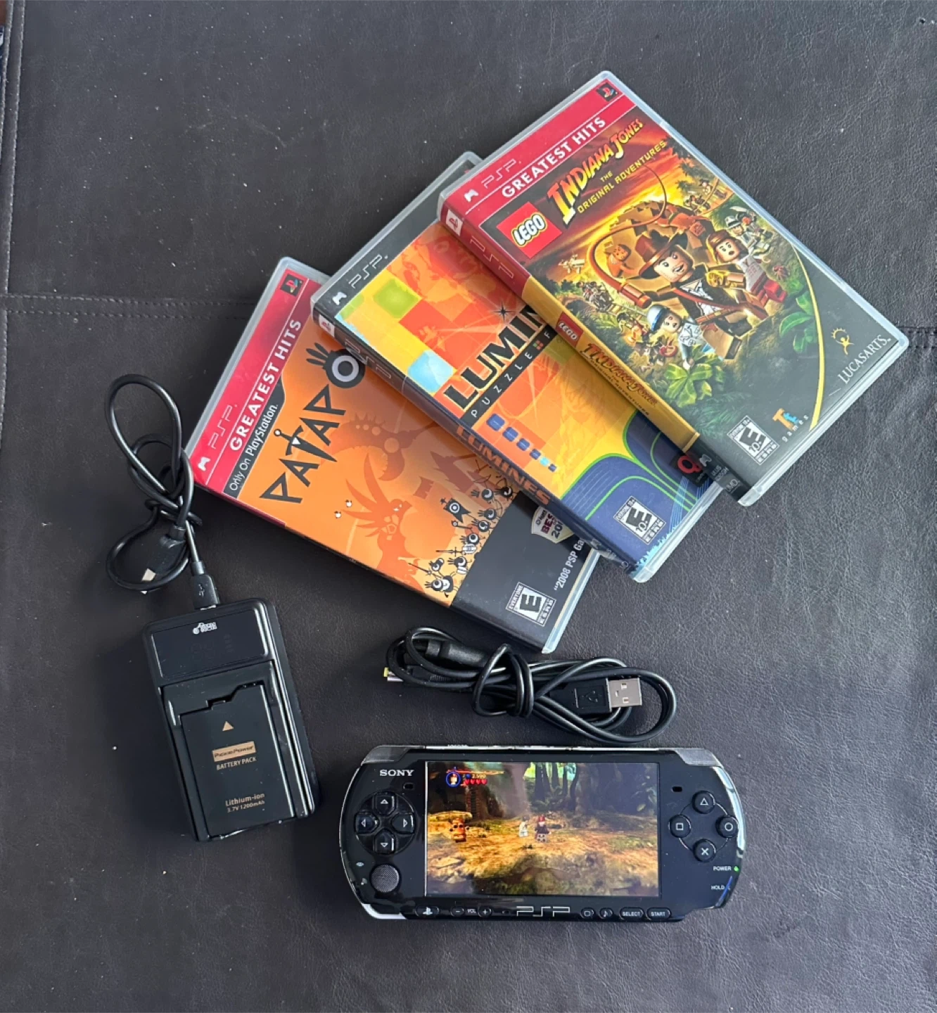 Selling a black Sony PSP 3001 handheld console! It comes with a charger and three games: Patapon, Lumines, and Lego Indiana Jones. Perfect for some retro gaming on the go.