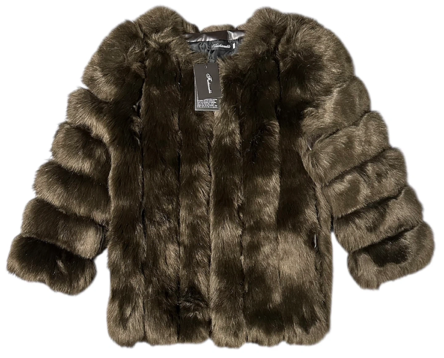 Here's a fashionable faux fur coat! It's a stylish piece to add to your wardrobe. The material is soft and warm, perfect for cooler weather. It's in great condition and ready for a new owner