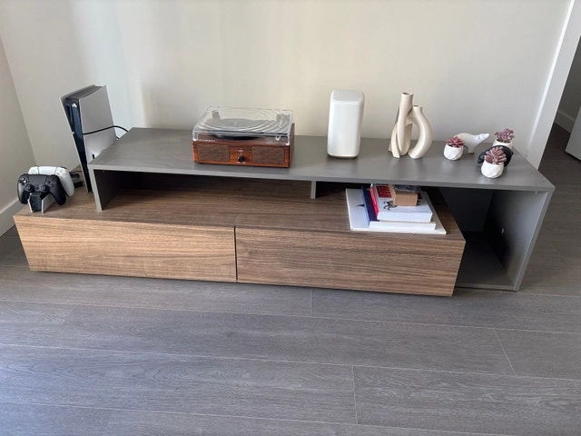 Selling because I’m moving to a smaller place and there’s no room for it. It’s in perfect condition. It’s about 180cm x 50cm and 42cm tall. Here’s the wayfair link: https://www.wayfair.ca/furniture/pdp/wade-logan-caven-tv-stand-for-tvs-up-to-80-c004227341.html?piid=89833276