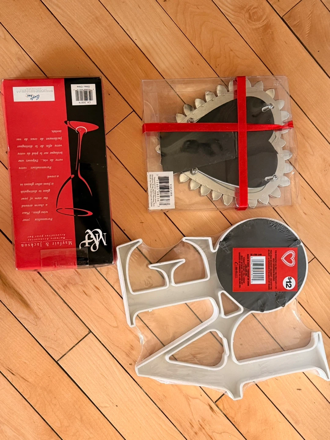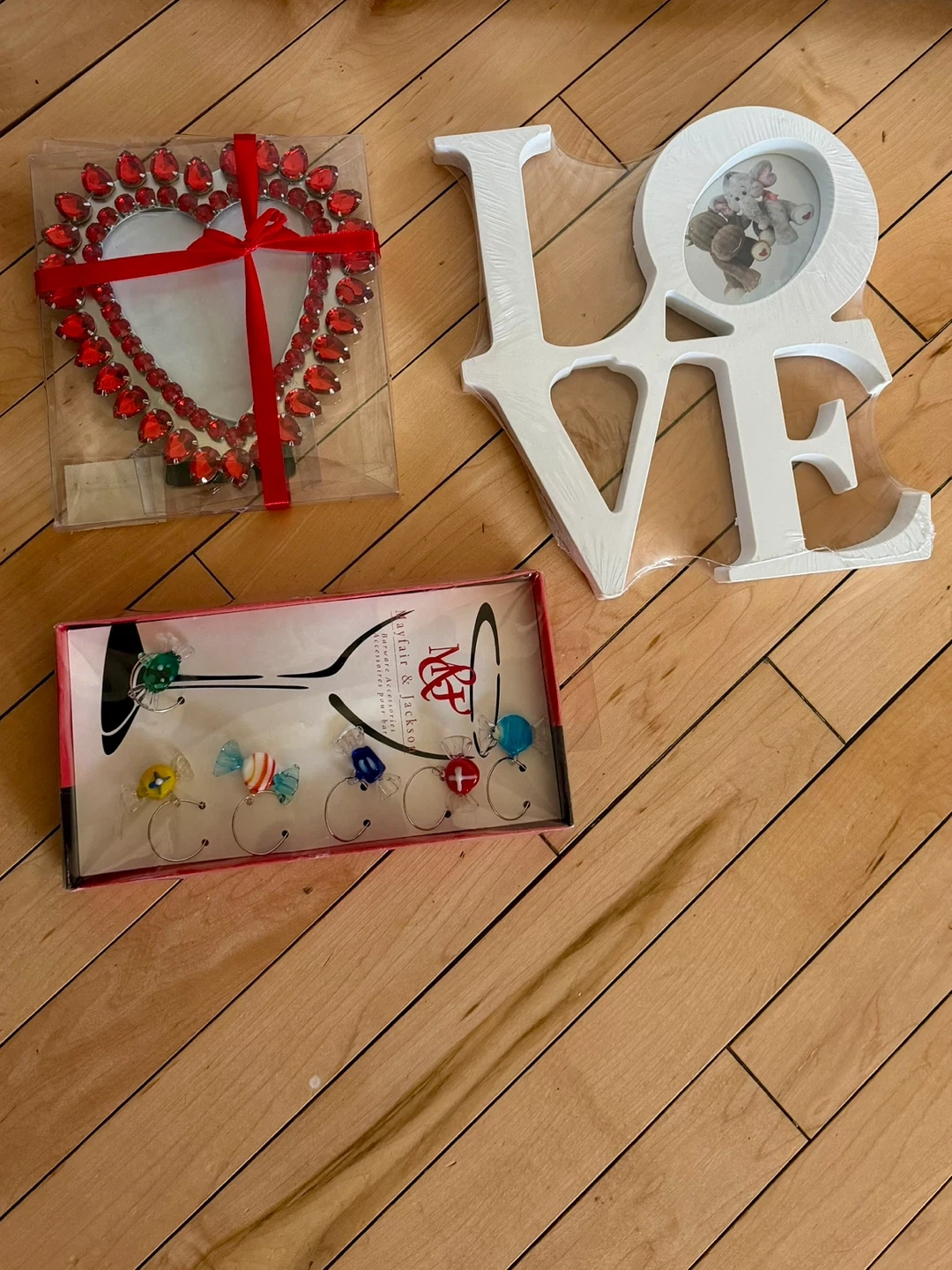 Selling a set of Mayfair & Jackson wine charms, still in the box! Also includes some decorative heart-shaped frames and a LOVE decoration, perfect for adding a touch of charm to your home or as a thoughtful gift for someone special