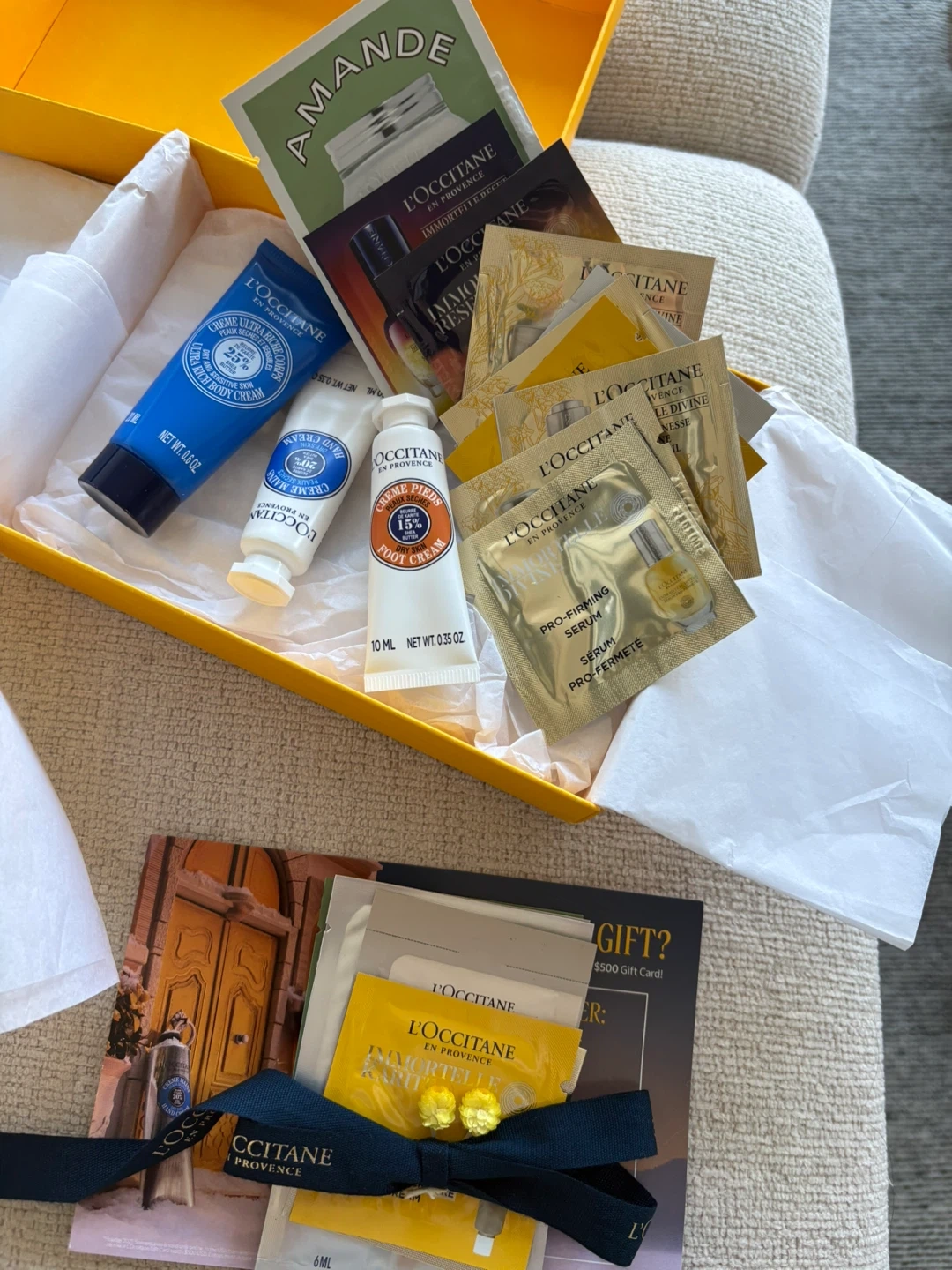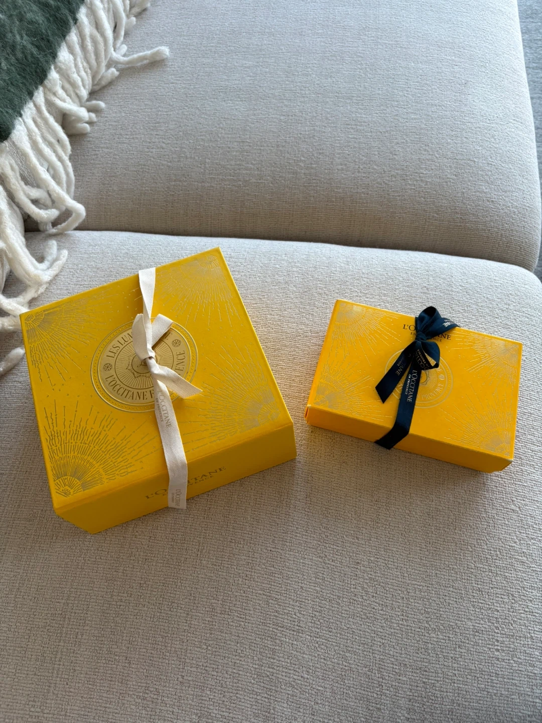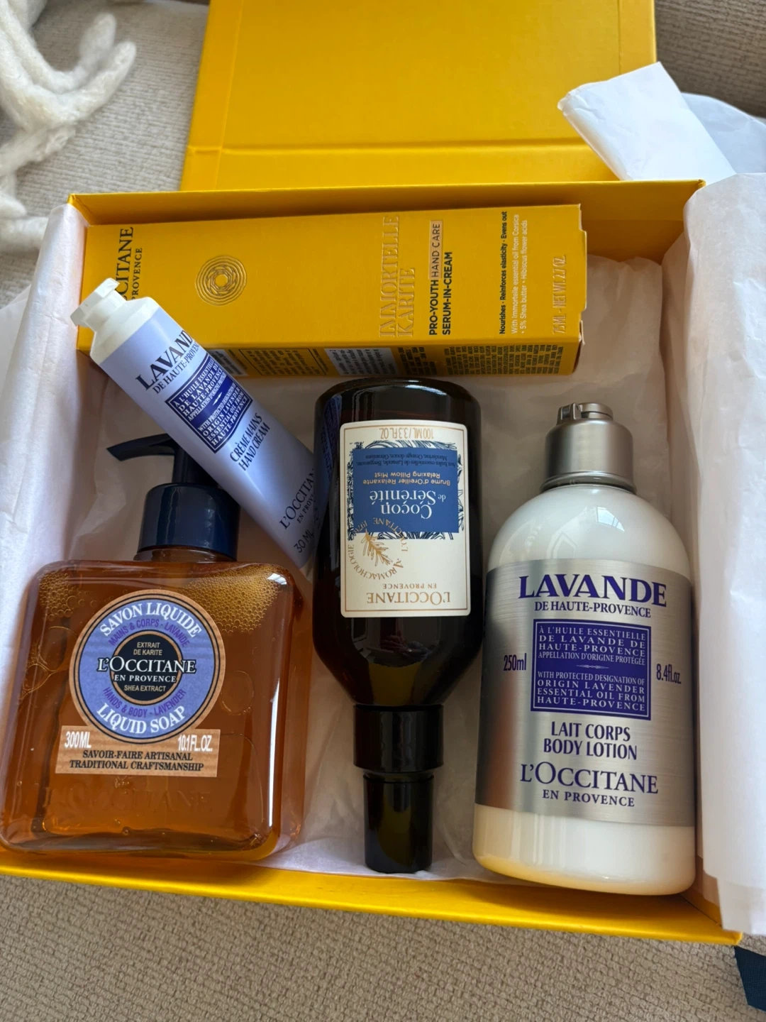 I have some L'Occitane gift sets available. They include a variety of skincare and body care products such as liquid soap, body lotion, hand cream, and more. These sets are perfect for gifting or treating yourself to some luxurious self-care