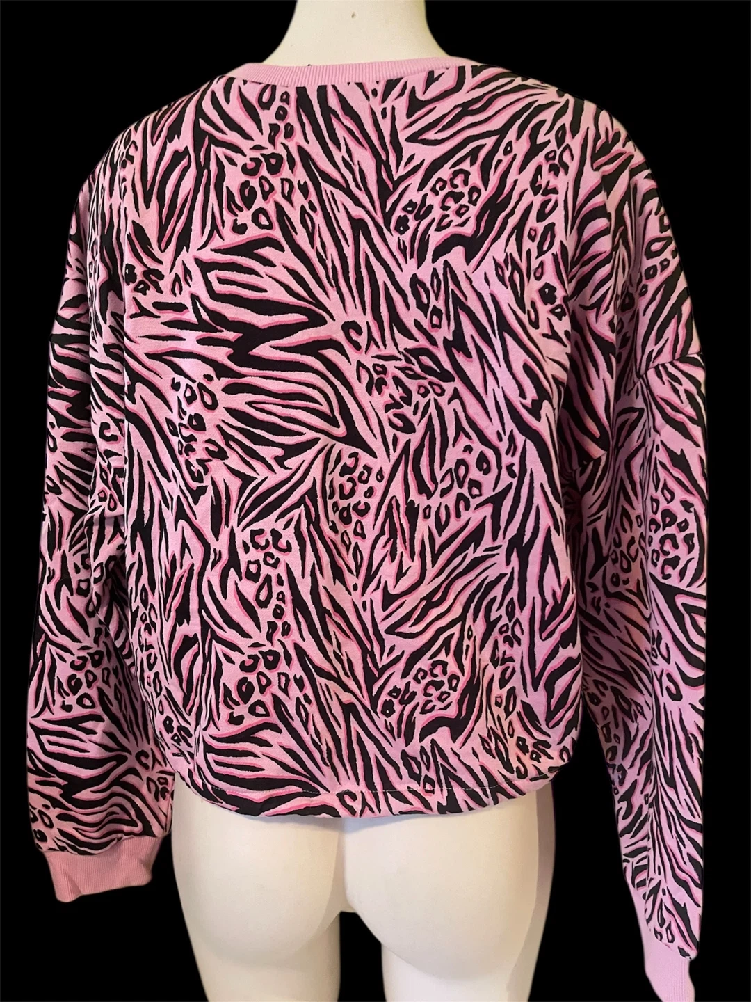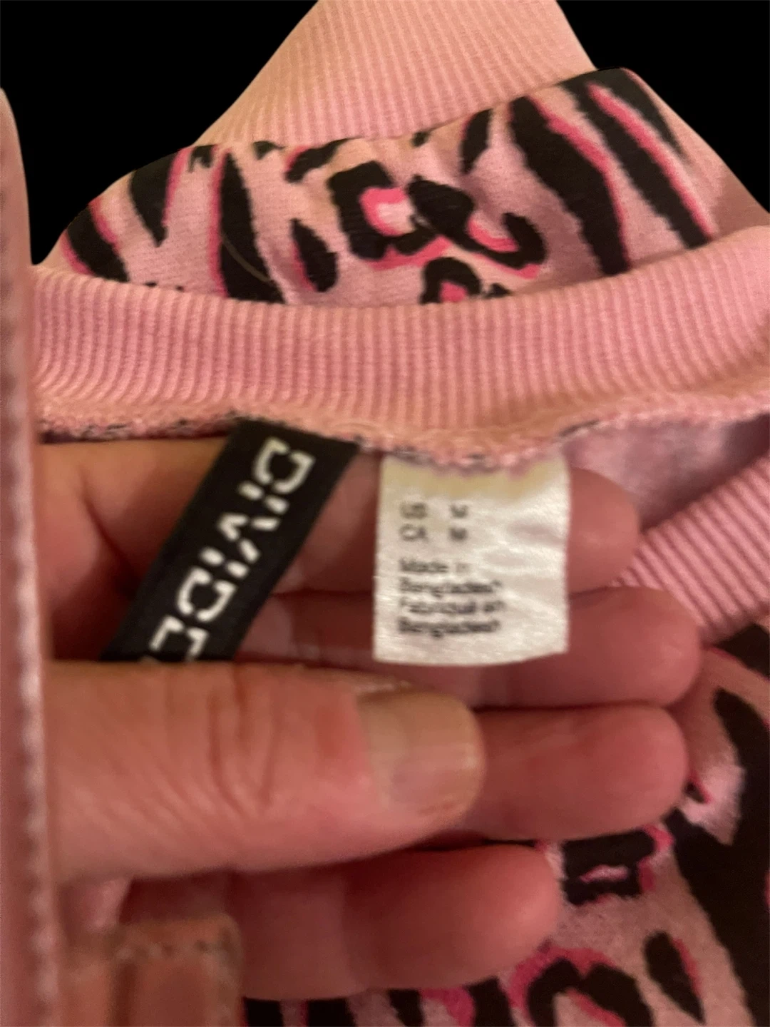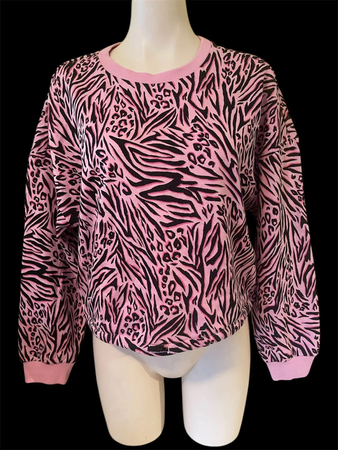 Cute H&M sweater with a fun pink and black animal print! It's a size medium and in great condition. Perfect for adding a pop of colour to your wardrobe. Draw string to tighten the sweater or not. See pictures for details.