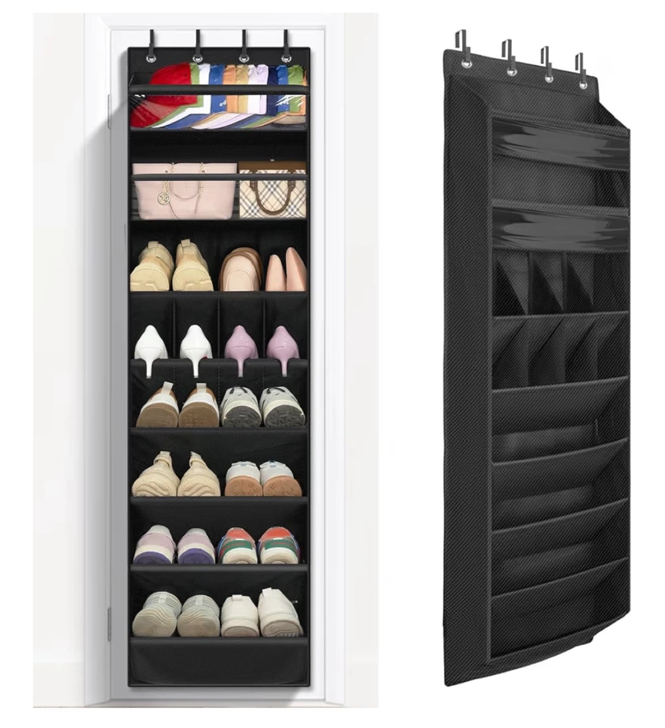 Hanging door organizer with space for shoes, etc. Very multipurpose, flat bottoms on the shelves help support any items.