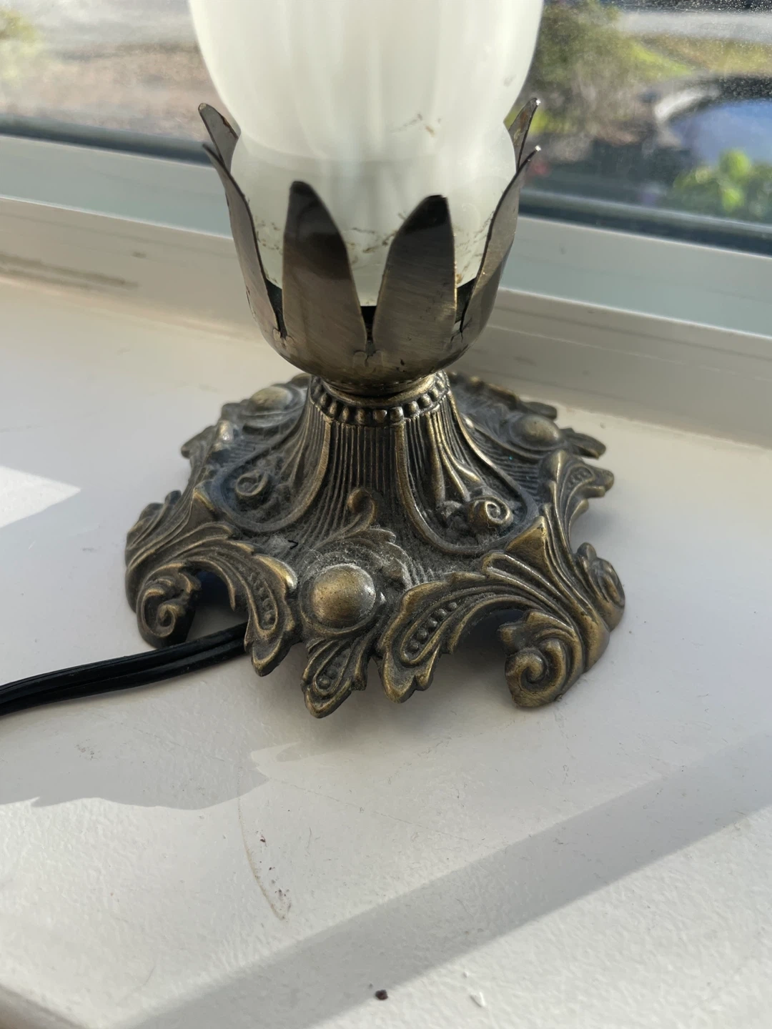 This is a beautiful vintage-style table lamp, perfect for adding a touch of elegance to any room. The white glass shade and ornate base give it a classic look that would complement a variety of decor styles. It's in great condition and ready to brighten up your space!