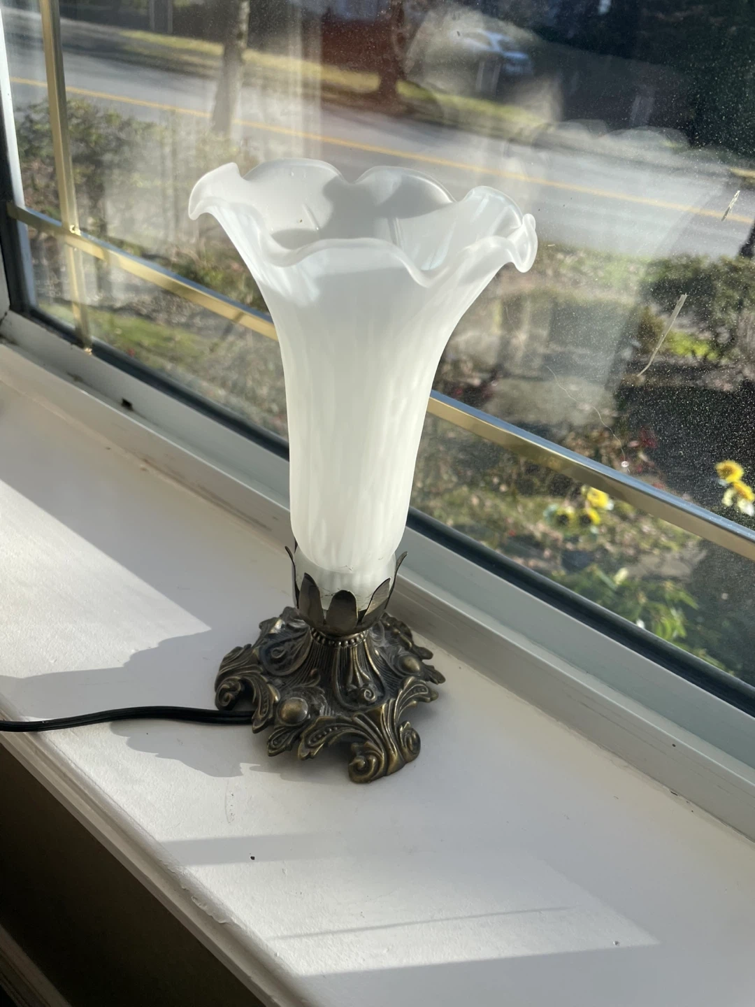 This is a beautiful vintage-style table lamp, perfect for adding a touch of elegance to any room. The white glass shade and ornate base give it a classic look that would complement a variety of decor styles. It's in great condition and ready to brighten up your space!