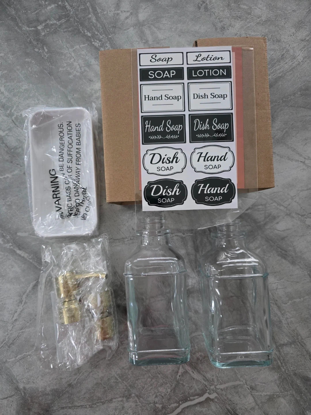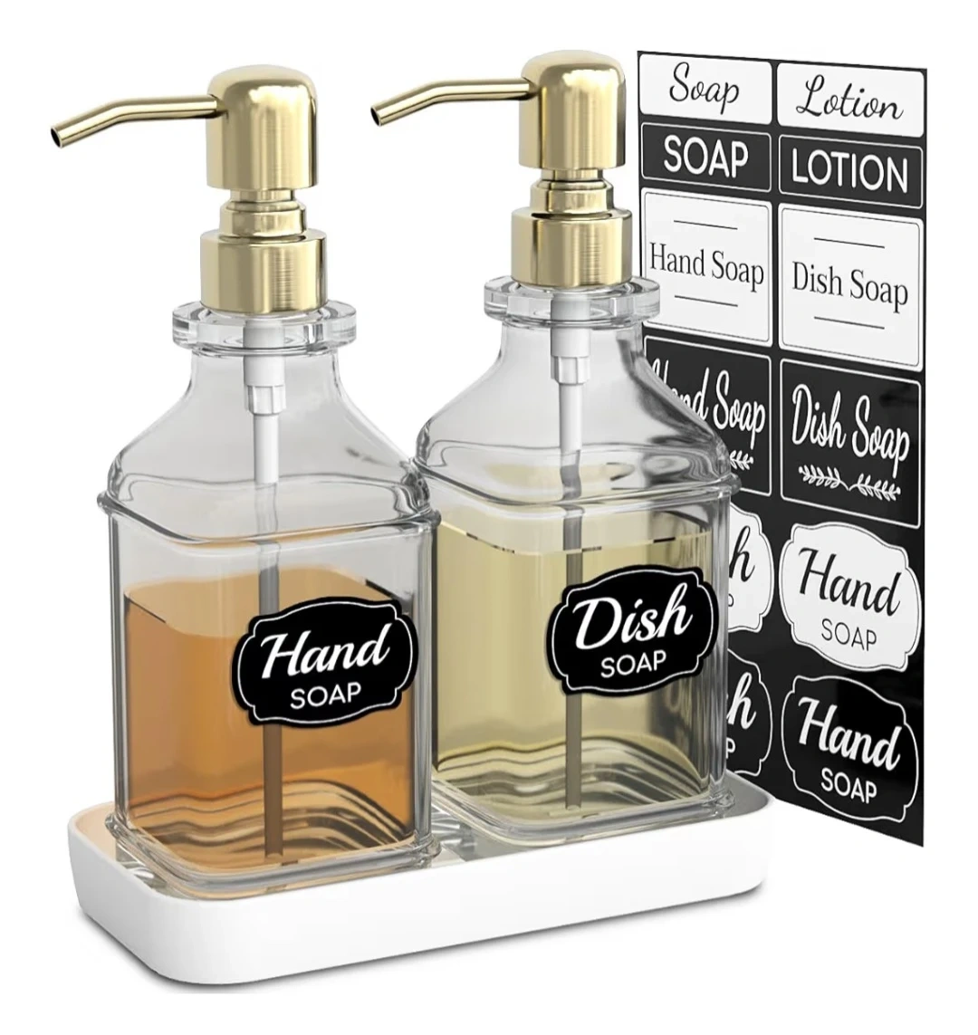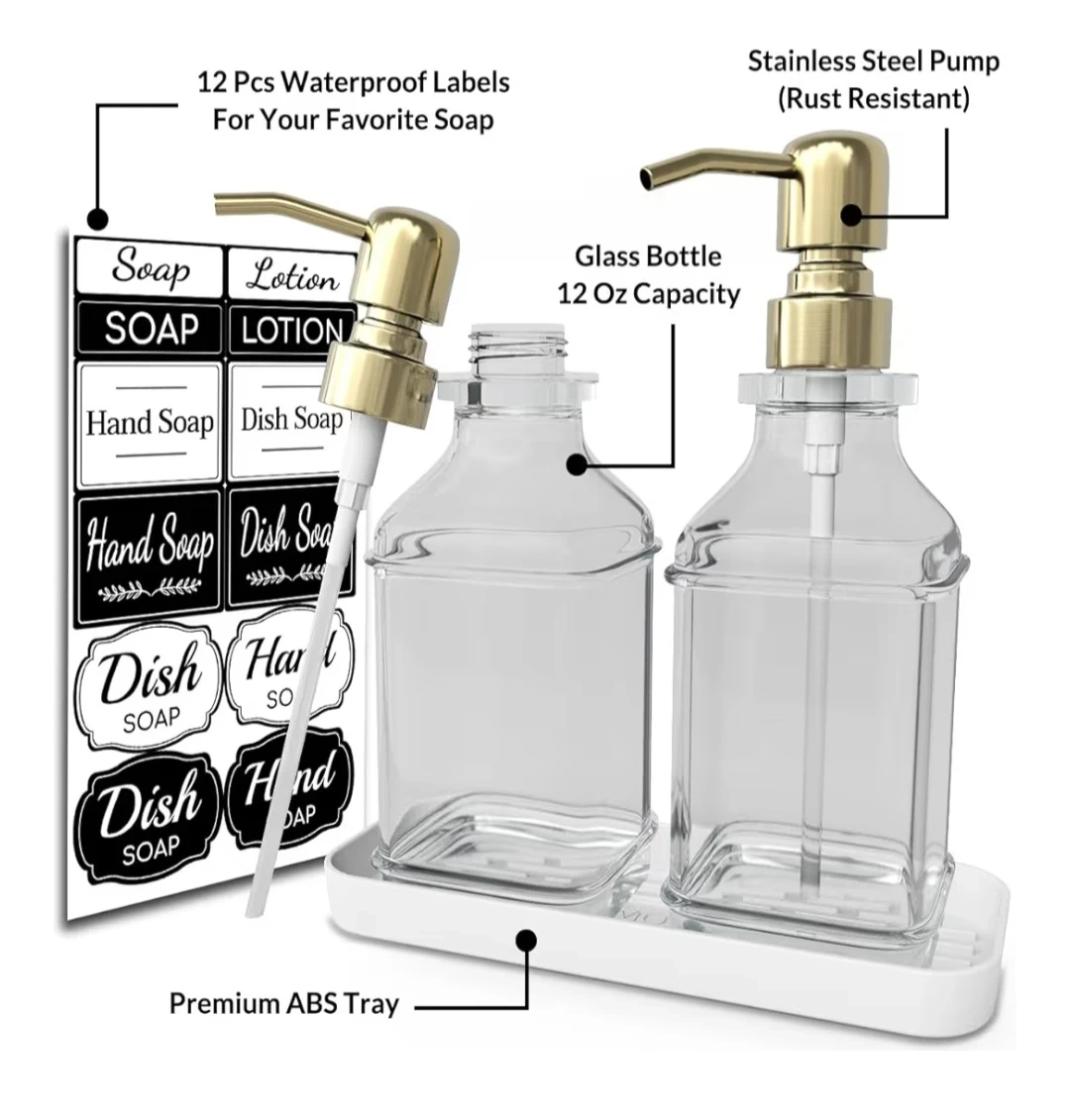 LMQML Soap Dispenser - 2 Pack, Antique Design Thick Glass Hand Soap Dispensers with Sturdy Tray; 304 Rust Proof Stainless Steel Pump, 12Pcs Stickers, for Kitchen, Bathroom