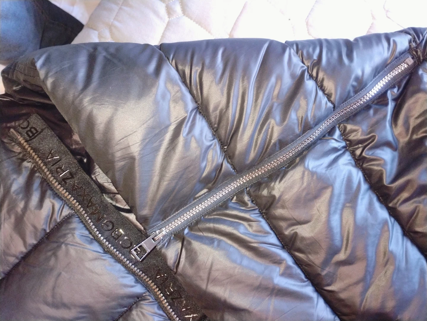 Here's a stylish black puffer coat from BCBGMAXAZRIA! It's made with a shell of 100% polyester and a lining of 100% nylon, ensuring warmth and comfort during those chilly days