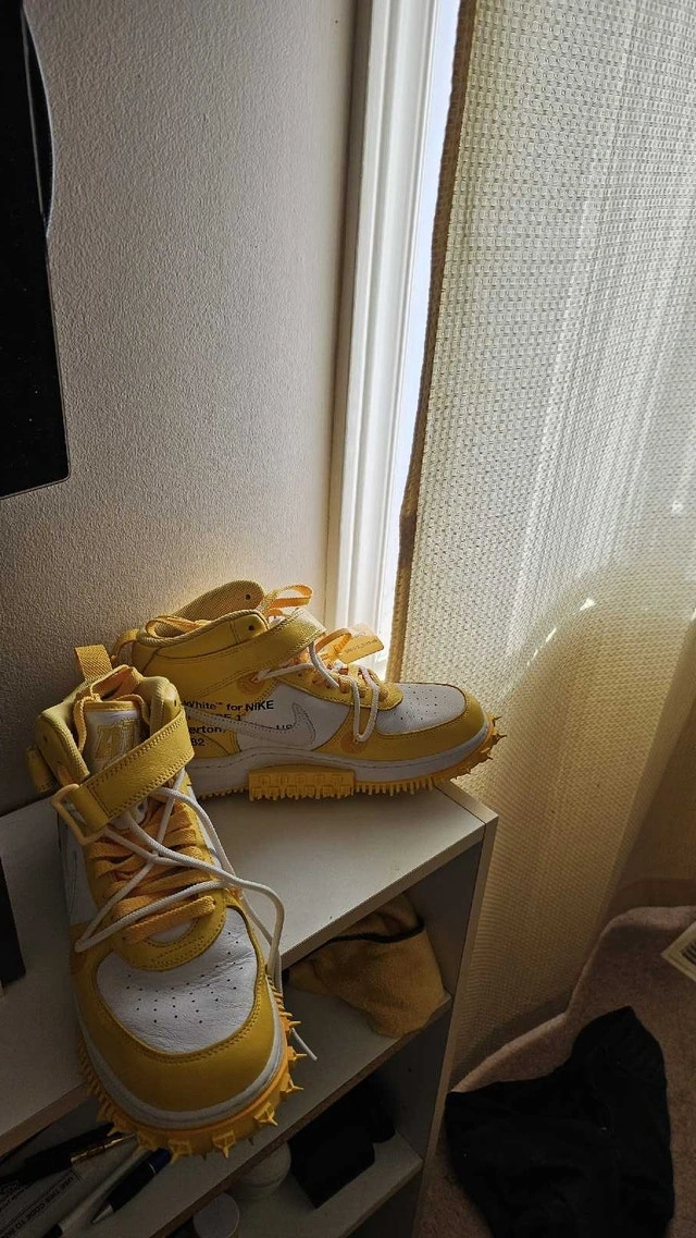 Size 9.5 (US men's) Off-White x Nike AF1 in the rare "Varsity Maize" colourway. Never been worn $200. Priced to sell before I leave the country Oct 31 Can meet in the GTA.