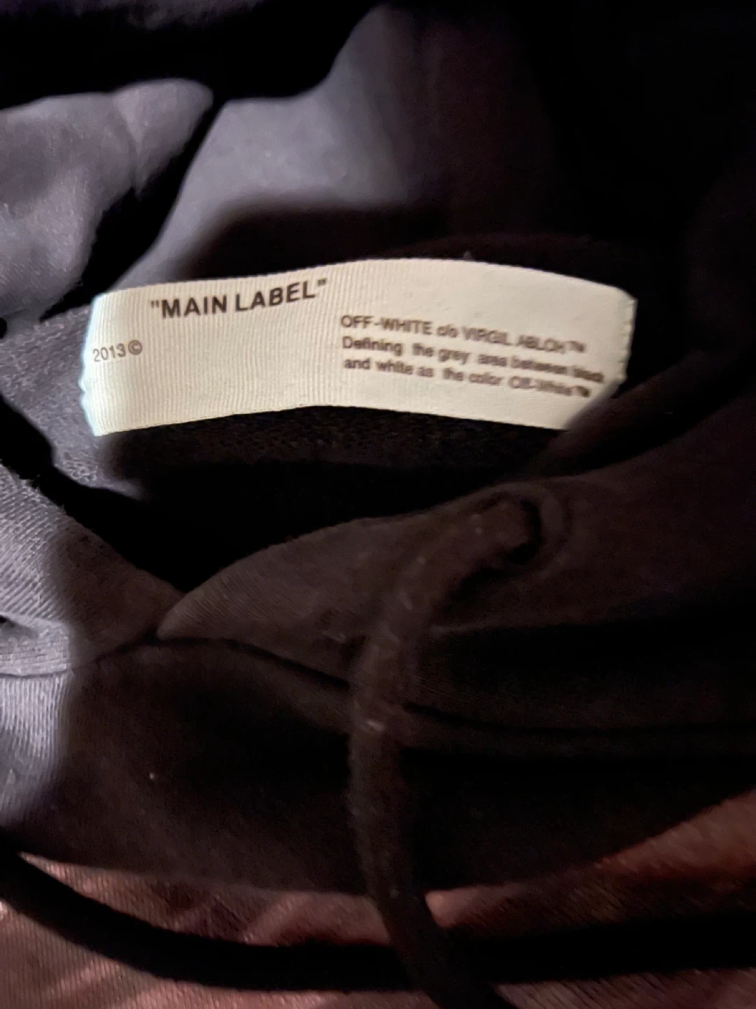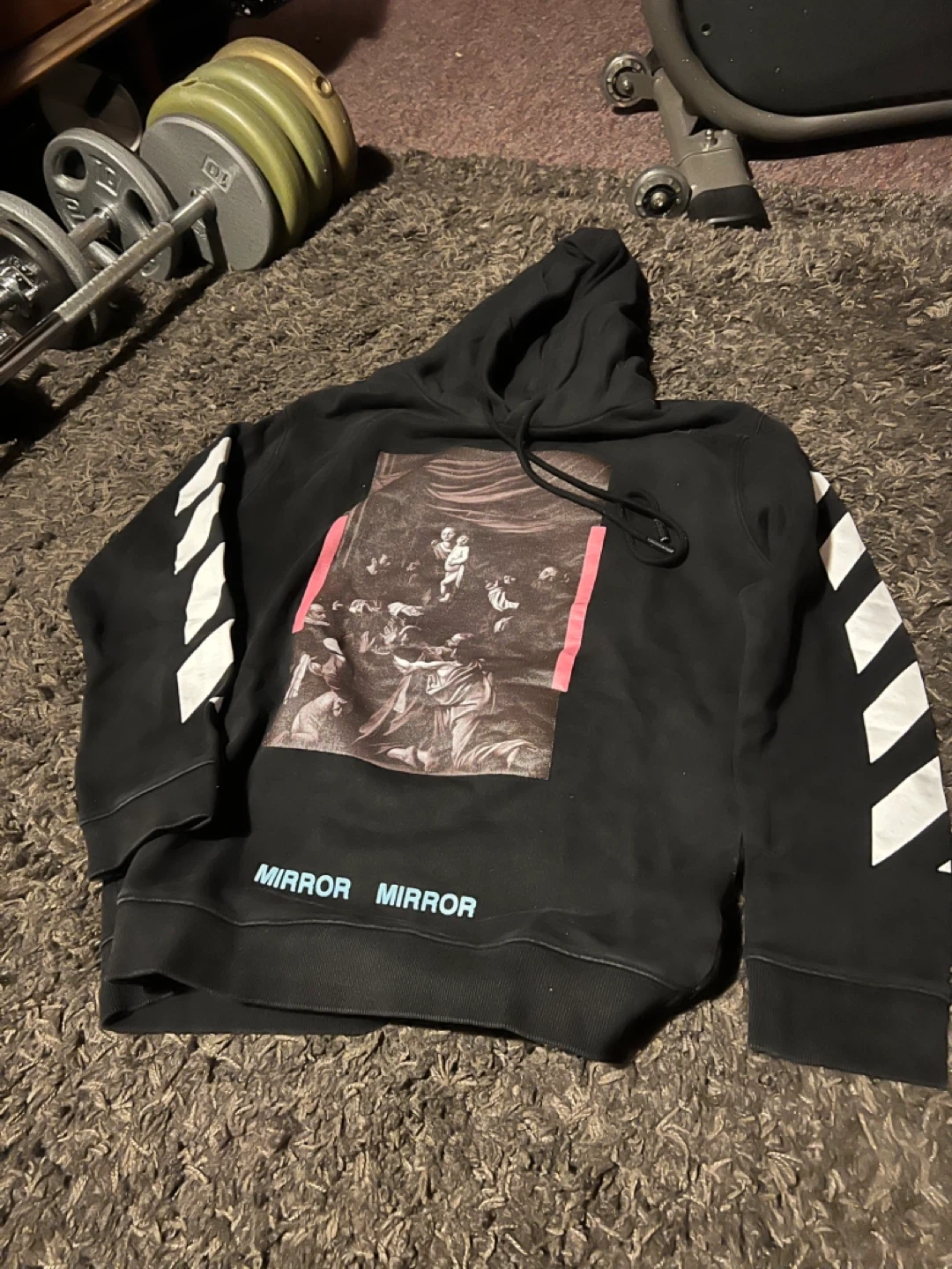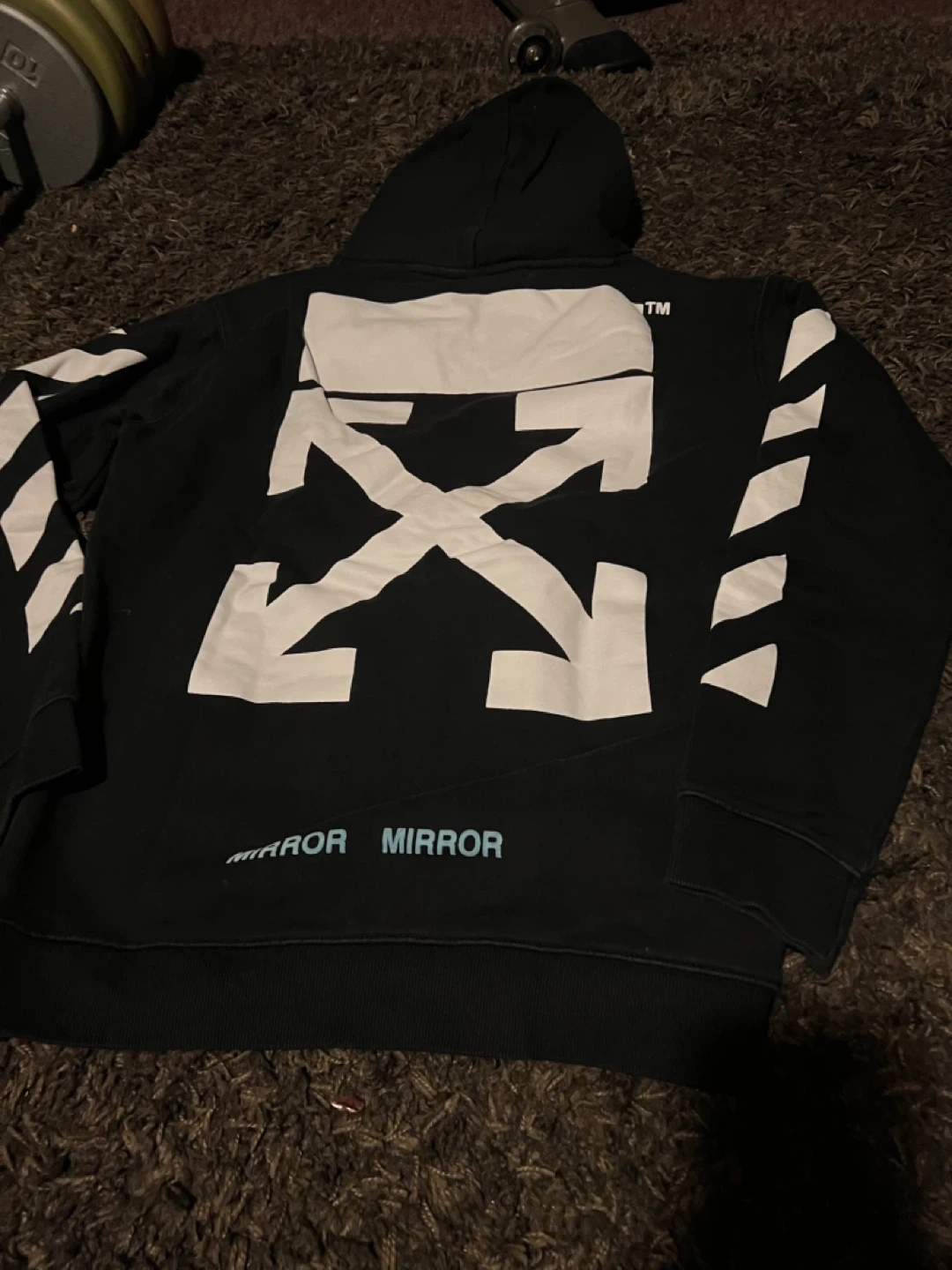 Selling a black Off-White hoodie. It features the iconic arrow design on the back and a graphic print on the front. The hoodie is in good condition and ready for a new owner!