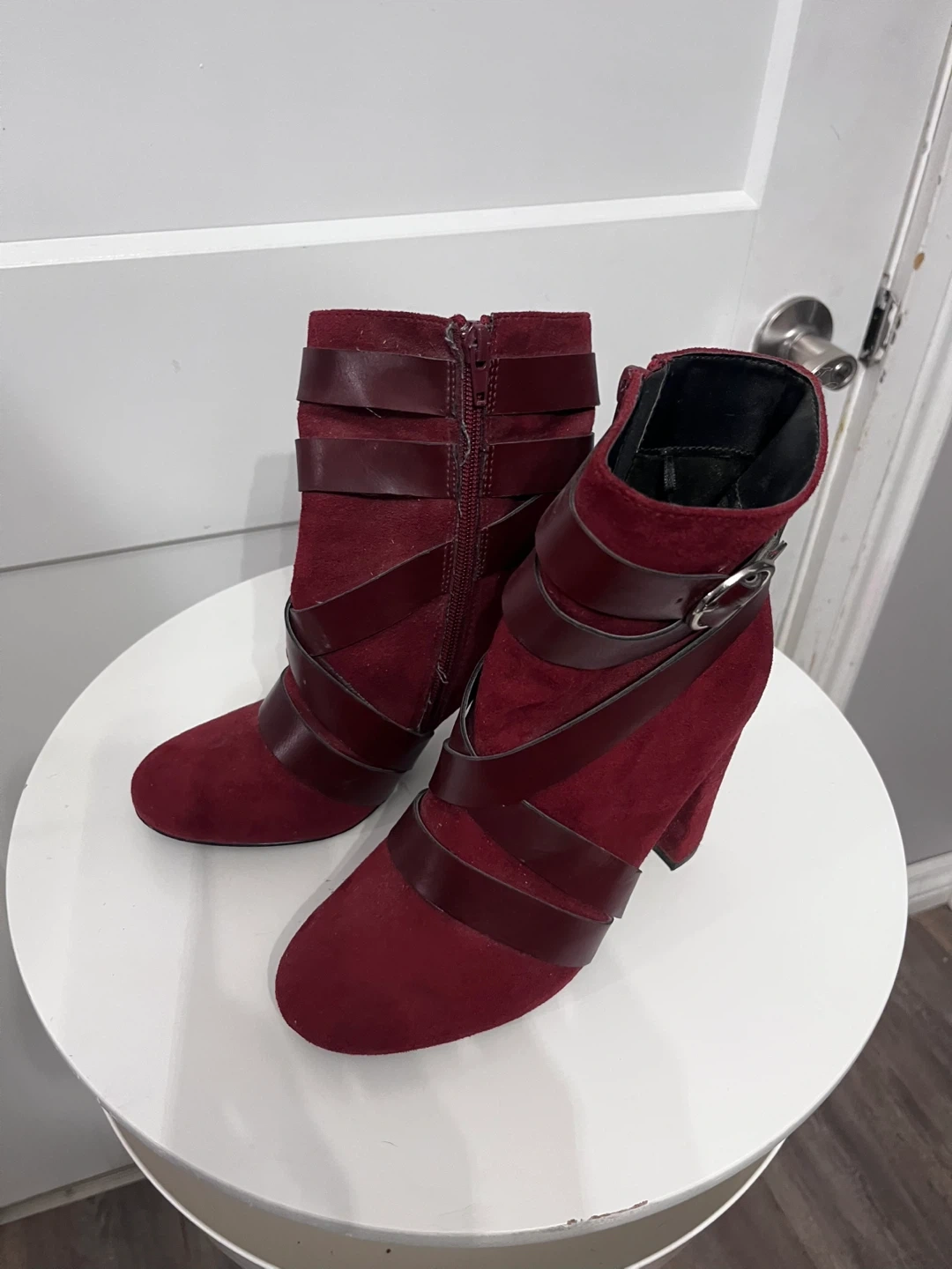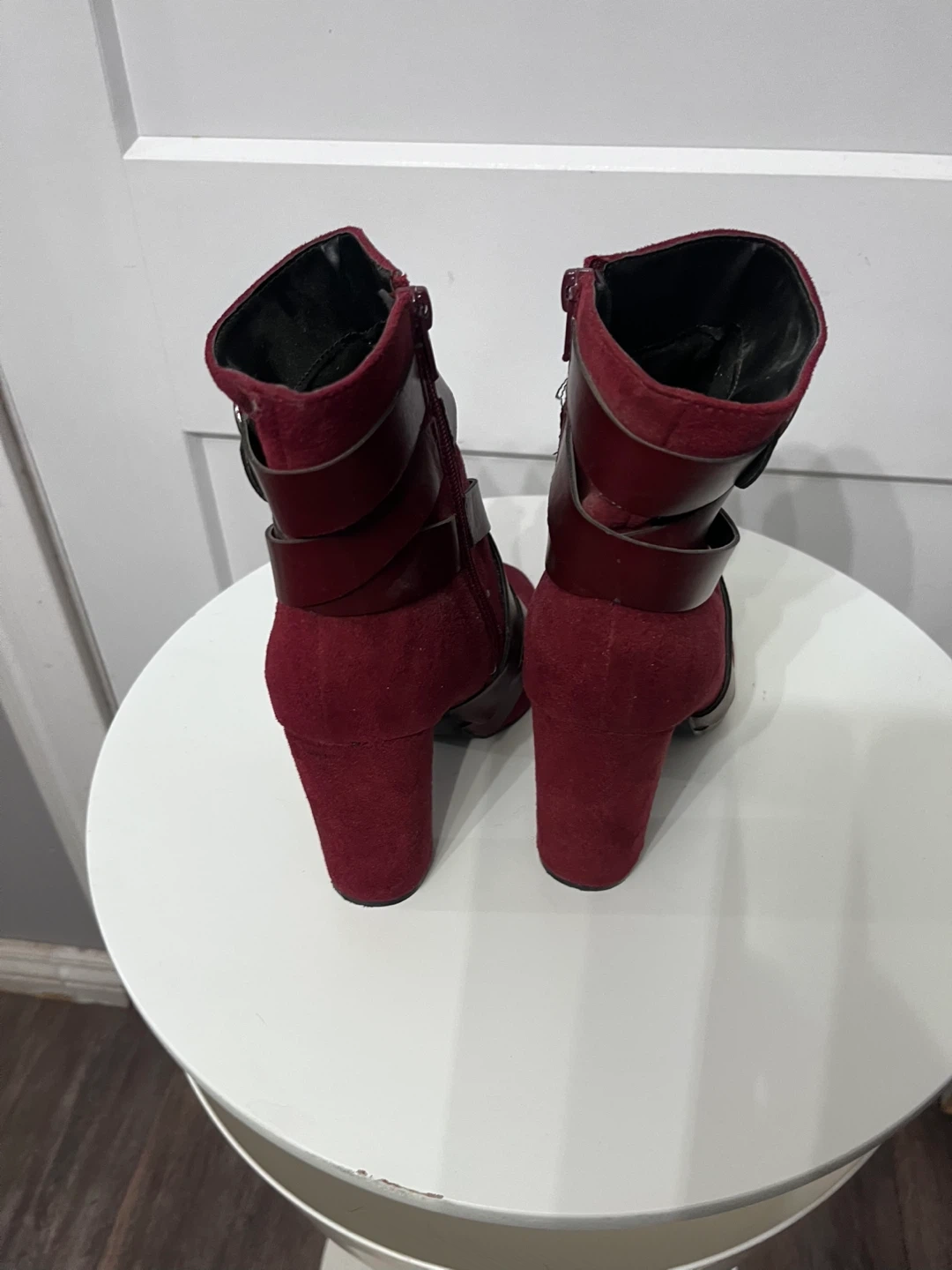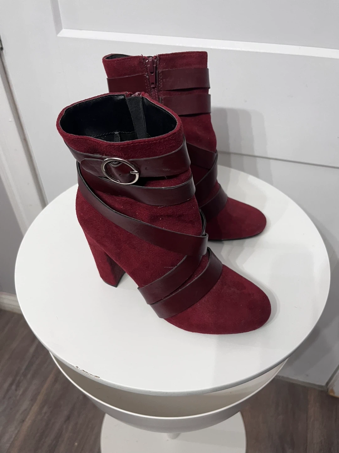 Selling a pair of burgundy heeled boots in size 7. They feature a stylish strap design and a comfortable heel height for all-day wear. These boots are perfect for adding a pop of colour to your outfit!