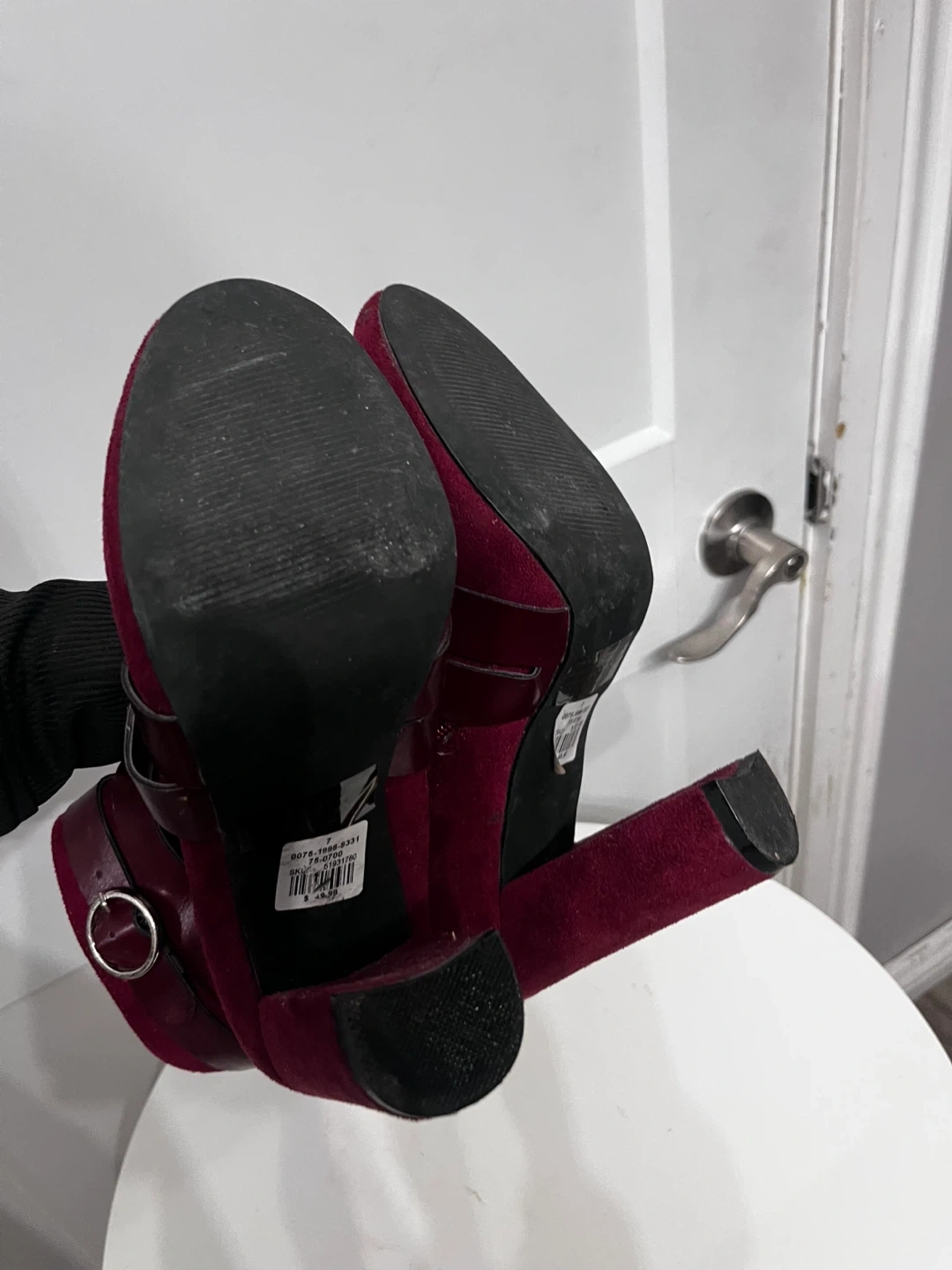 Selling a pair of burgundy heeled boots in size 7. They feature a stylish strap design and a comfortable heel height for all-day wear. These boots are perfect for adding a pop of colour to your outfit!