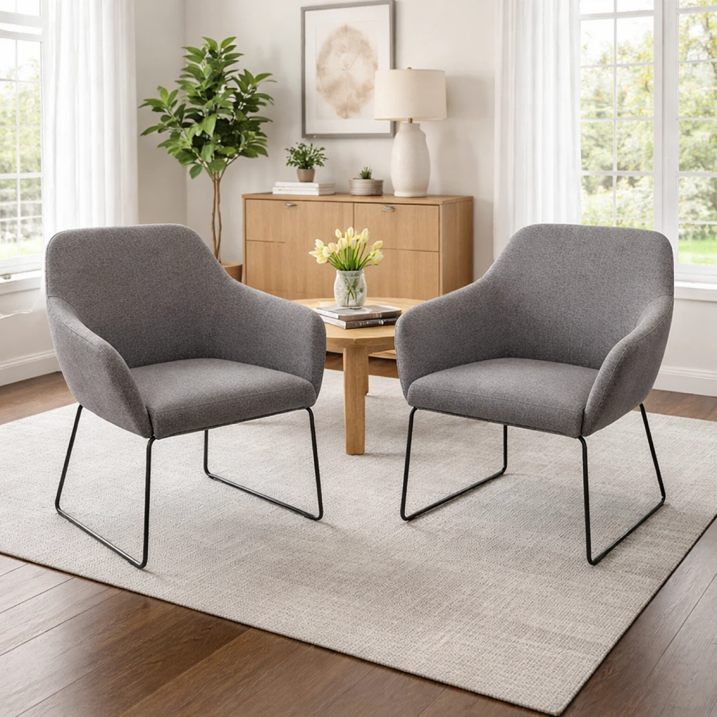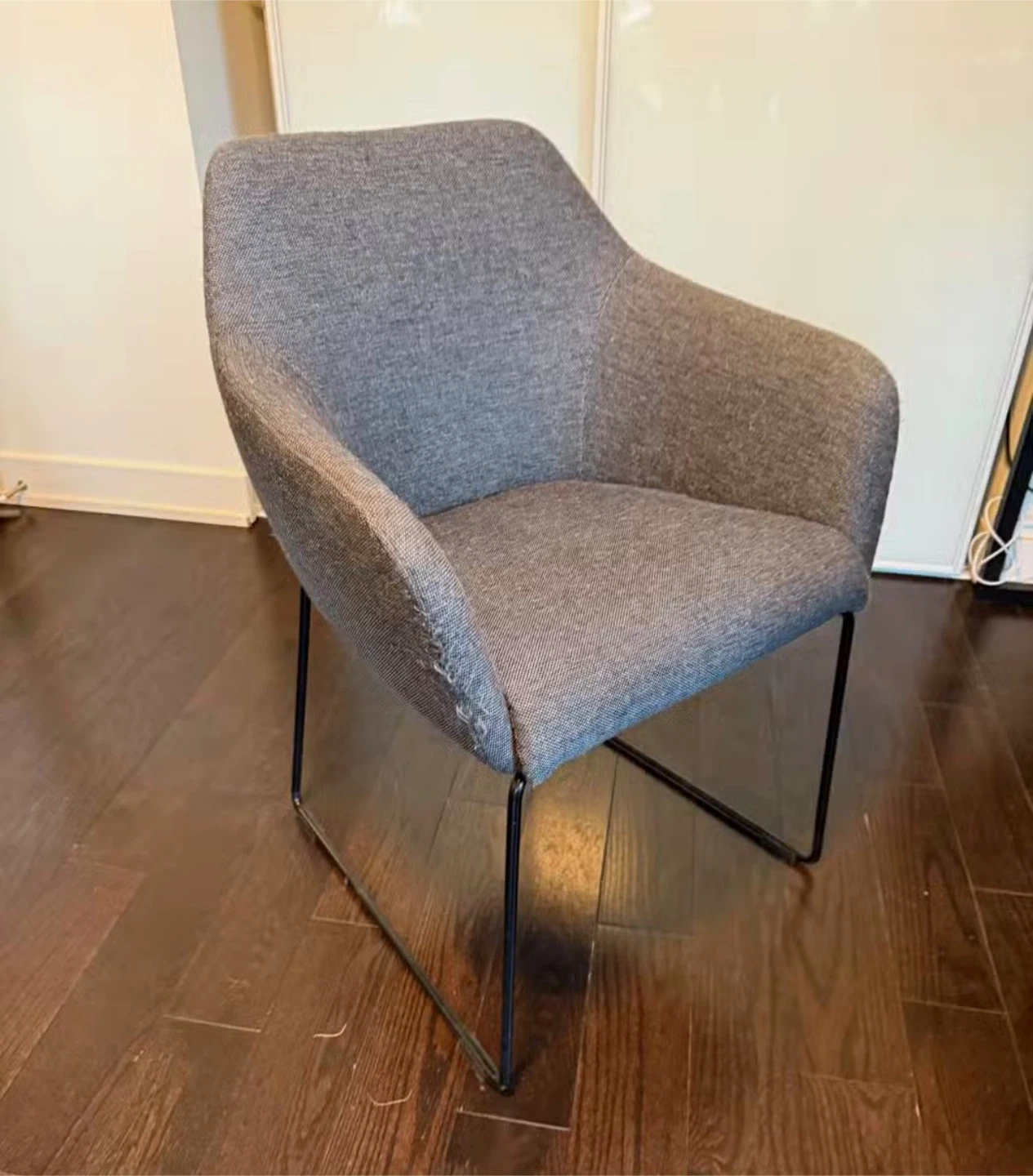 Here's a stylish grey upholstered armchair! It's in good condition and would look great in any living room or office space. The chair features a comfortable seat and back, along with sleek black metal legs. Perfect for adding a touch of modern elegance to your home