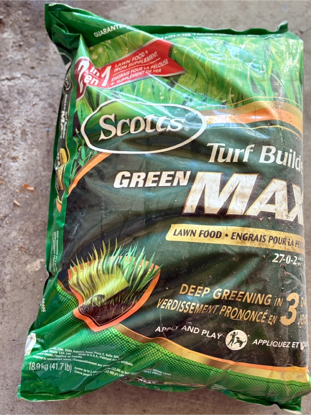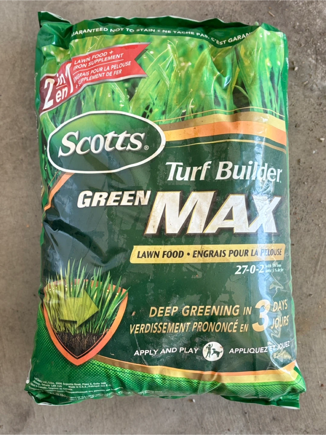 Selling a bag of Scotts Turf Builder Green Max lawn food. It's a lawn food and iron supplement that helps with deep greening in 3 days. It's a 27-0-2 formula and comes in a 18.9 kg (41.7 lb) bag
