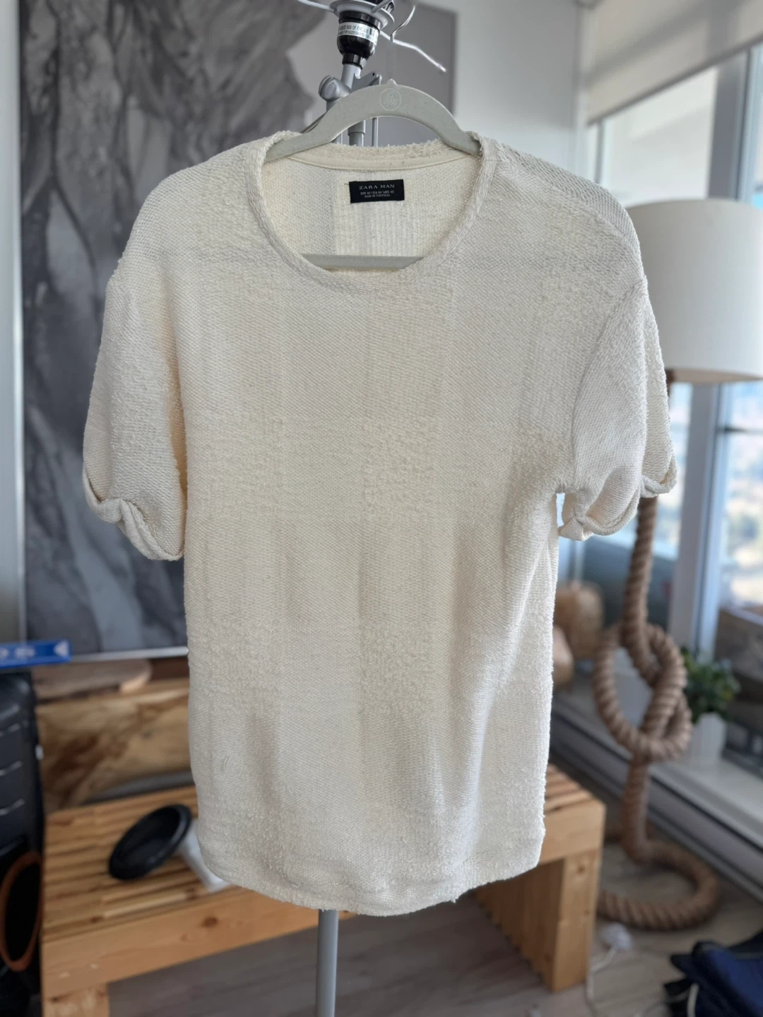 Selling a Zara Man textured t-shirt in cream colour. It's a size M and made in Portugal. This shirt is in great condition and ready for a new wardrobe!