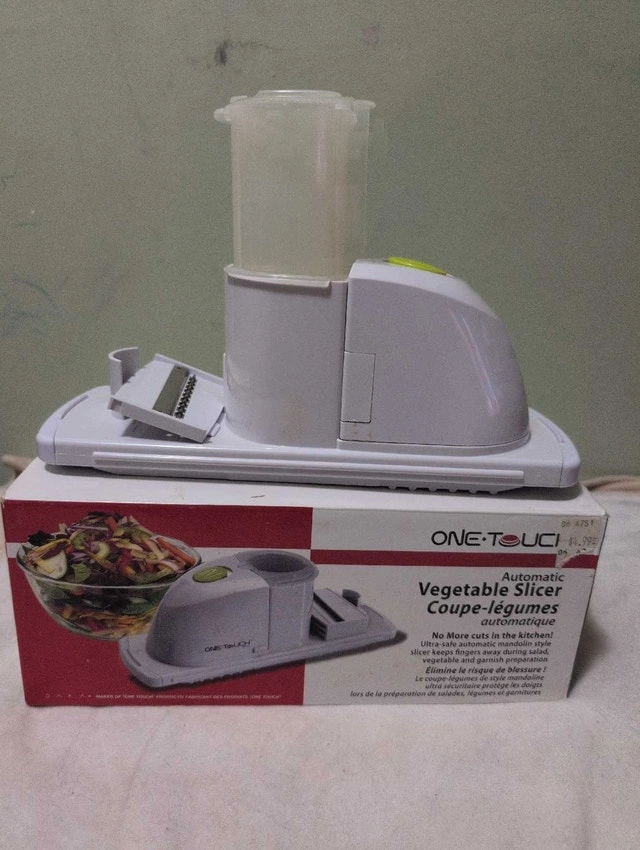 This is a used One-Touch automatic vegetable slicer. It's an ultra-safe automatic mandolin style to dice, julienne, slice, wedge, shred vegetables, and prepare garnishes. It has some wear and tear. If the ad is still up, then it's still available!