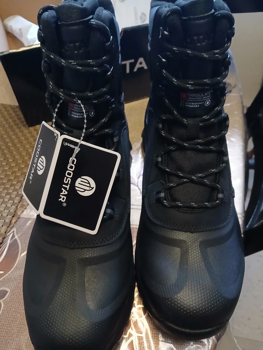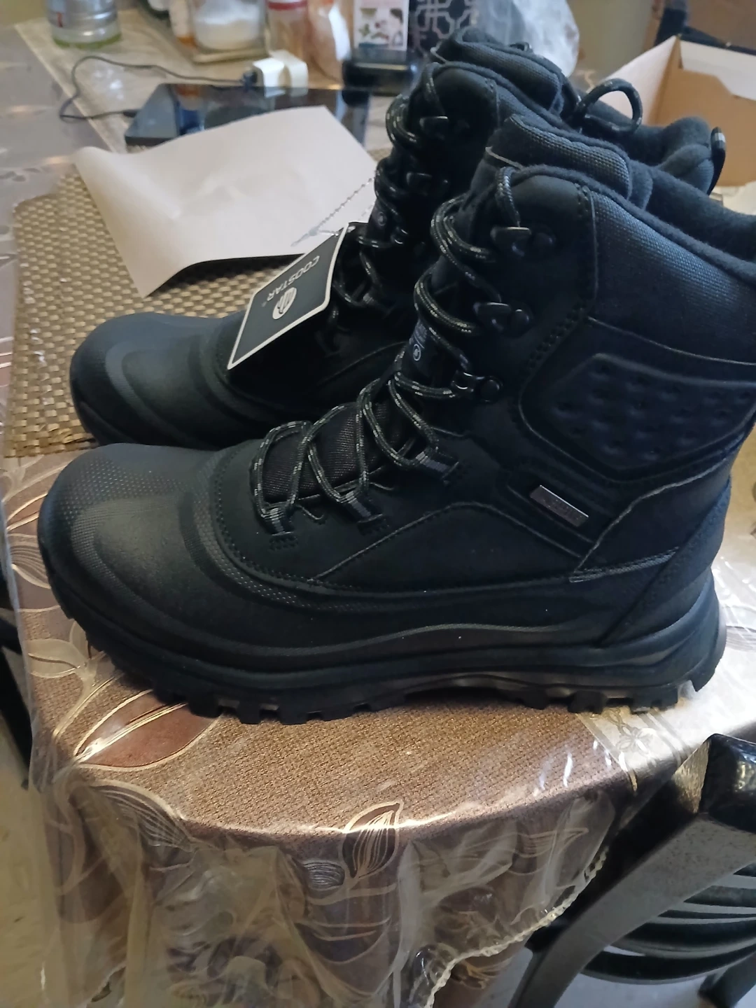 Selling a pair of COOSTAR insulated winter boots for men. They're black and have a lace-up closure. Great for keeping your feet warm and dry in the winter weather
