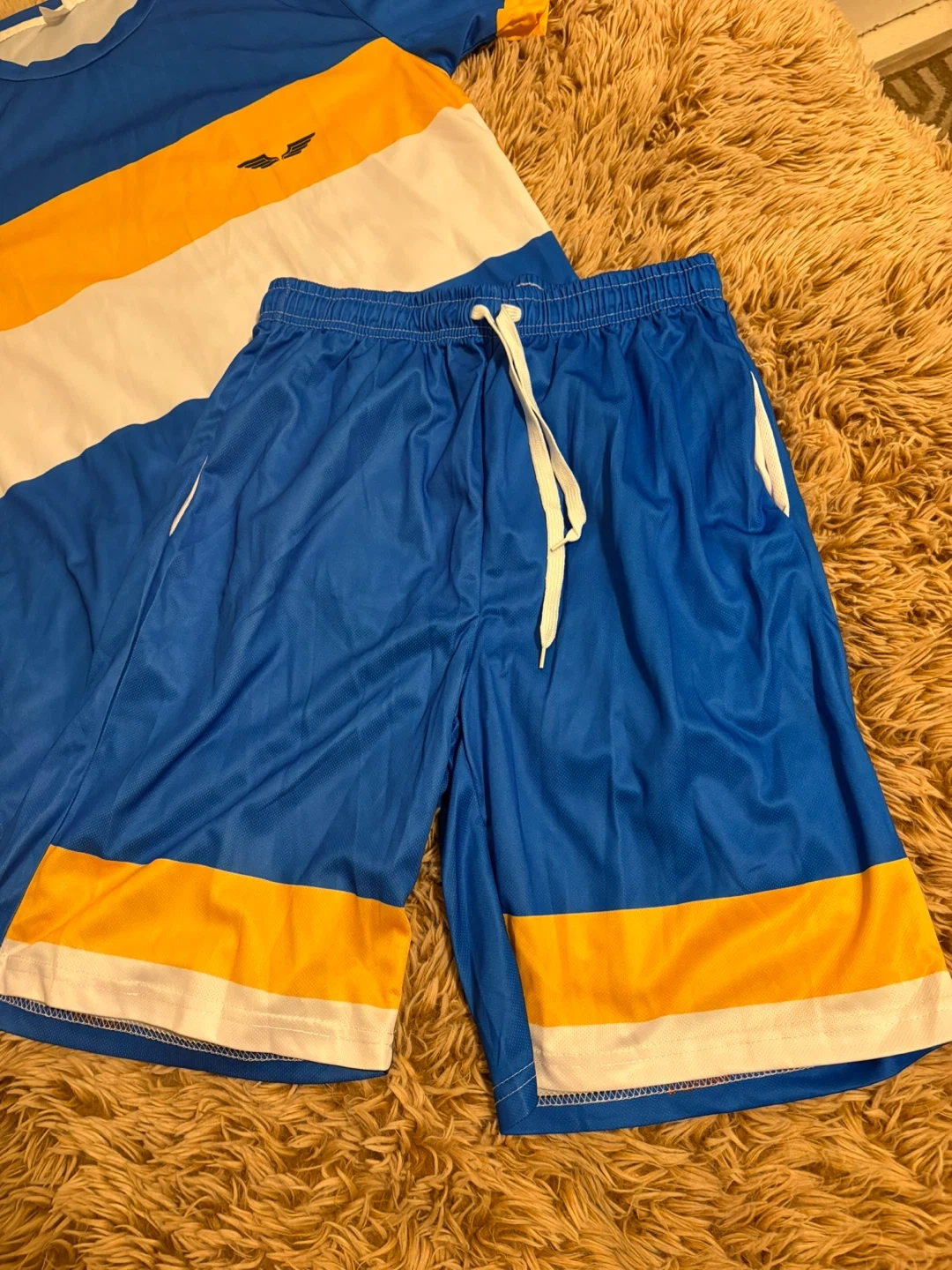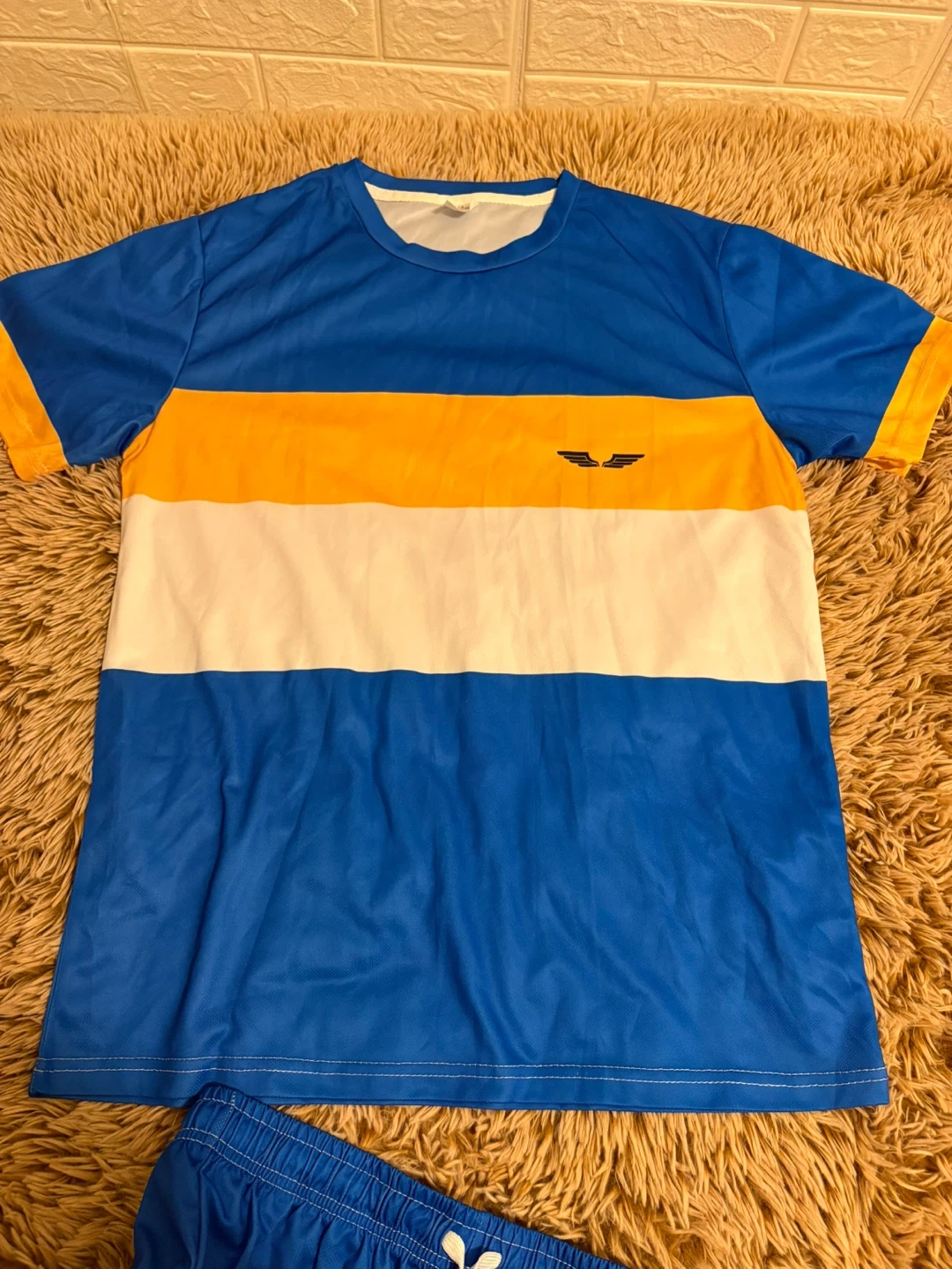 It is a set of t-shirt and shorts for men in blue, white and orange colors, similar to the clothing of the Los Angeles Chargers.