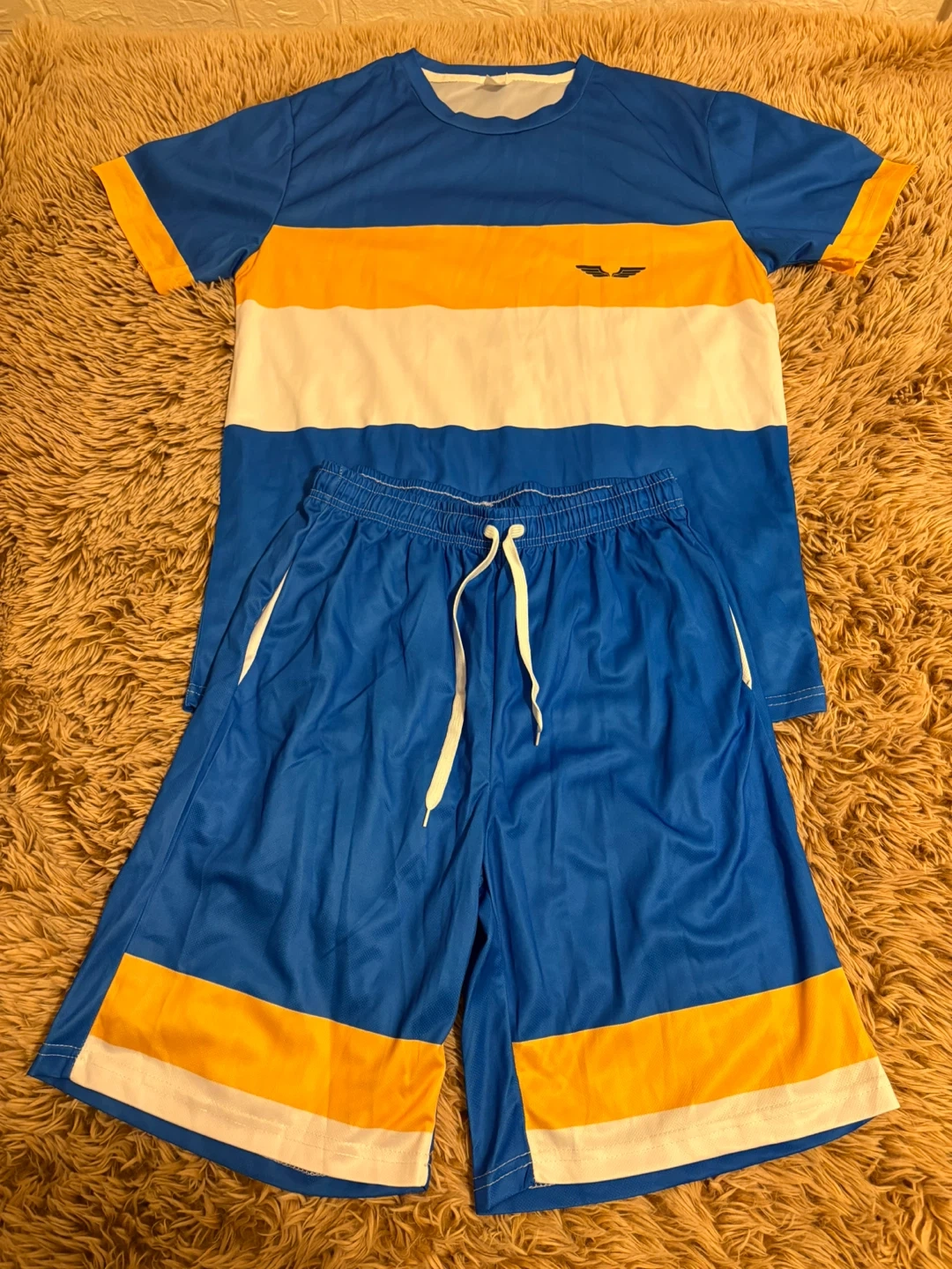 It is a set of t-shirt and shorts for men in blue, white and orange colors, similar to the clothing of the Los Angeles Chargers.