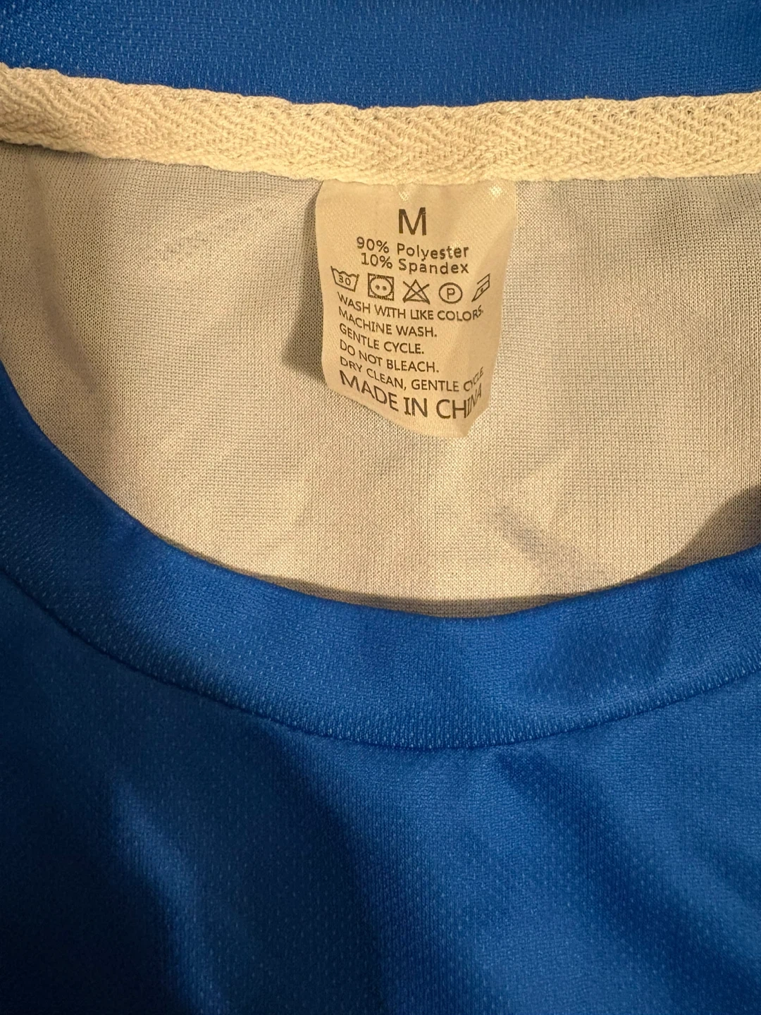 Selling a blue and gold outfit in size medium. The material is 90% polyester and 10% spandex.