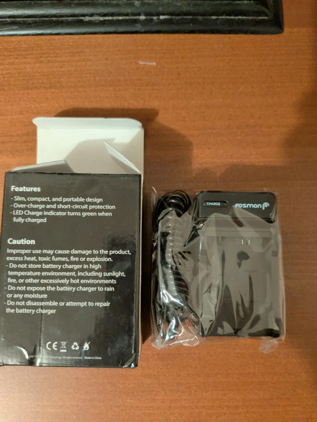 Selling a brand new Fosmon camera/camcorder battery charger, still sealed in its original packaging! It features a slim, compact, and portable design. The LED charge indicator turns green when fully charged. Includes the charger and cable