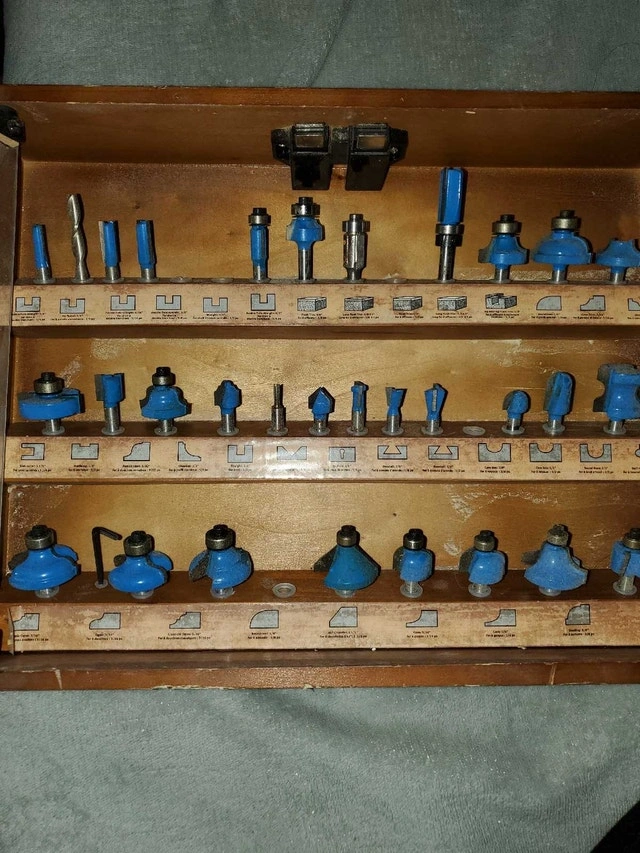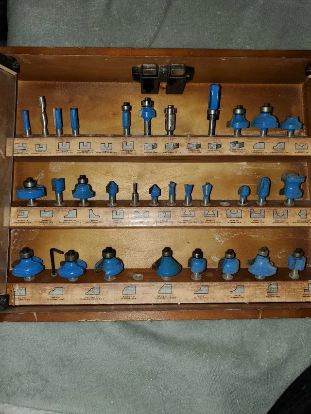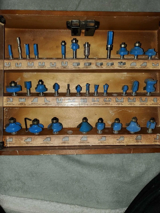 Perfect for woodworking enthusiasts and professionals. This set includes a variety of bits for different cutting and shaping needs. Here's what you'll get: * Various Router Bits * Wooden Storage Case Looking for $100 the blue bits aren't used they are all brand new. A few are missing but everything in the picture is included. Located in Port credit